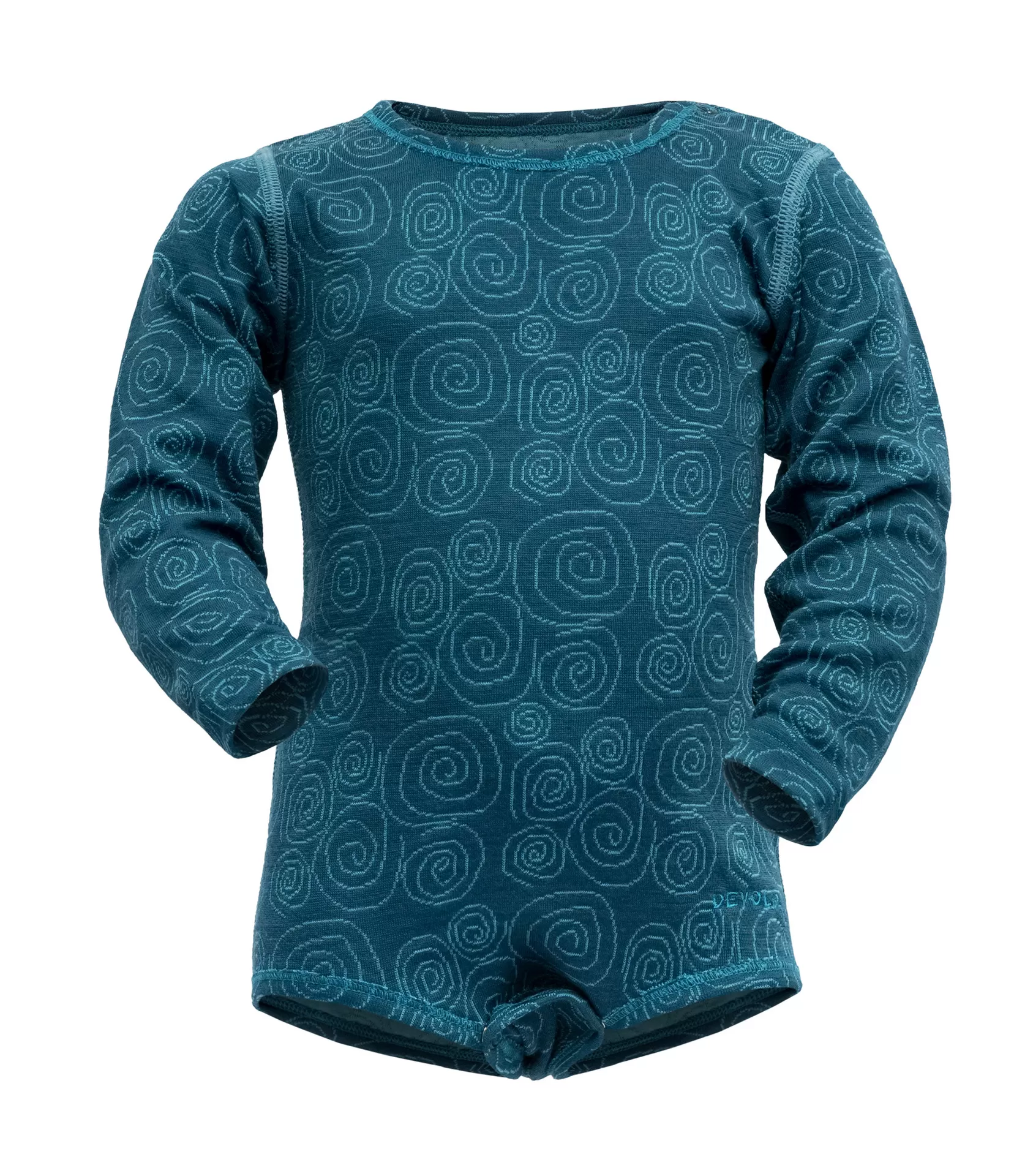 Šie zilās “Flood” krāsas Devold Duo Active Merino bodiji zīdaiņiem uzreiz piesaista skatienu ar savu smalko, mierīgo dizainu. Smalks, ar virpuļiem dekorēts raksts piešķir apģērbam rotaļīgumu, taču saglabā estētiski tīru izskatu un ir viegli saskaņojams ar citām mazuļa garderobes detaļām. Tas ir apģērbs, kas izskatās skaisti gan ikdienas rutīnā, gan īpašākos brīžos.