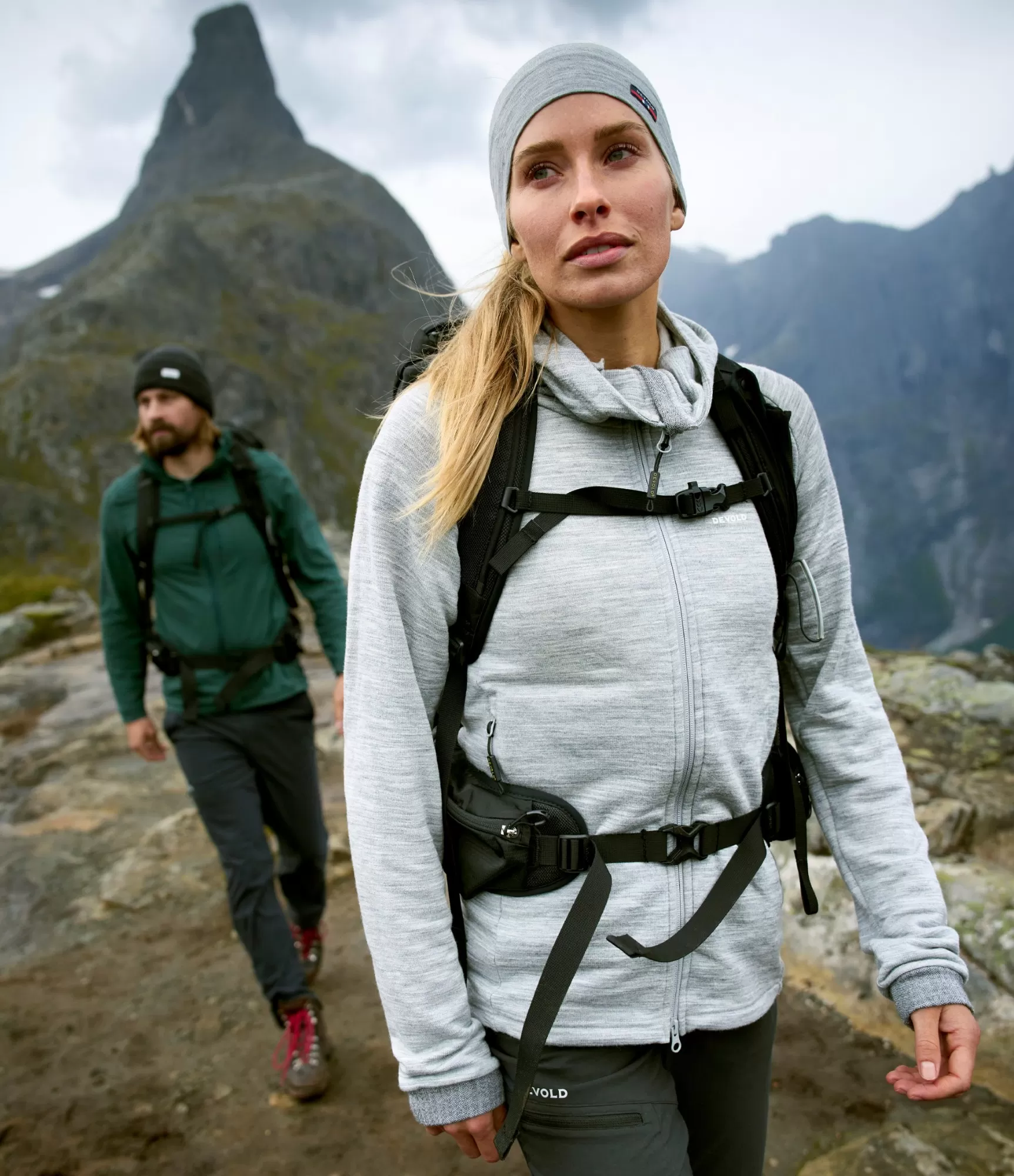 Devold Nibba Merino Jacket Hood Woman ir sieviešu merino vilnas džemperis ar pilnu rāvējslēdzēju un kapuci, radīts ērtai valkāšanai visa gada garumā atkarībā no laikapstākļiem. Izgatavots no 100 % merino vilnas, šis 210 g/m² auduma džemperis nodrošina dabisku siltumu, bet saglabā vieglumu un piemērotību gan ikdienai, gan aktīvai kustībai. “Grey Melange” pelēkā krāsa ir praktiska un universāla – to viegli kombinēt ar sporta biksēm, džinsiem vai brīvā laika apģērbu, tādēļ džemperis lieliski der gan pilsētai, gan dabai.