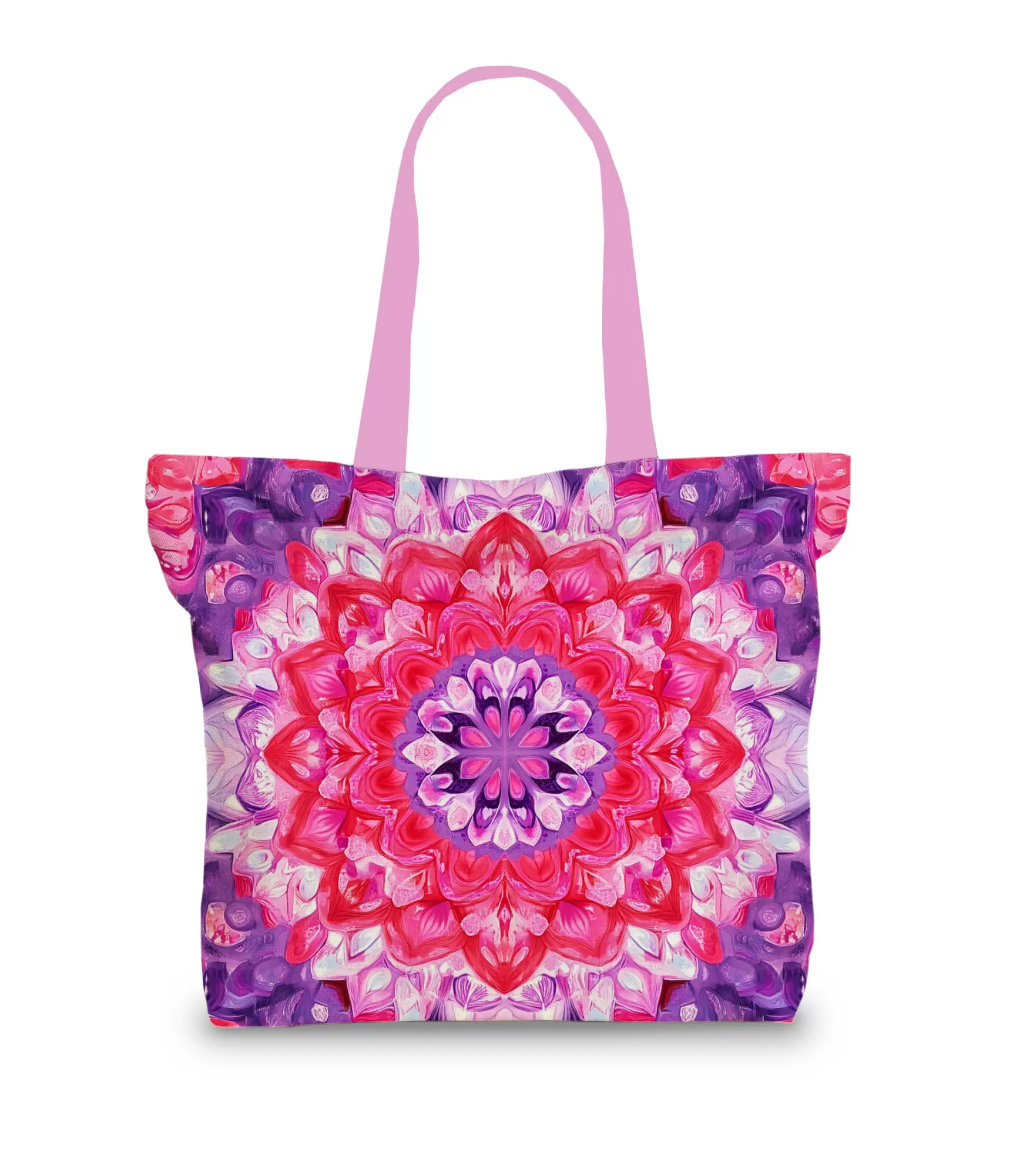 Mandala rokassomiņā – ne tikai ornaments. Šis ir centrs, iš kas izstaro krāsas, domas, uzmanību. Tajā nav dziļuma, bet arī prieka. Tas simbolizē veselumu, iekšējo harmoniju un spēku būt pašam pat tad, kad pasaule liek bēgt. Fons ir pilns ar purpursarkanām niansēm – miera, radošuma un pārliecības krāsas. Un centrālais rozā – šsirds, kas mirdz.