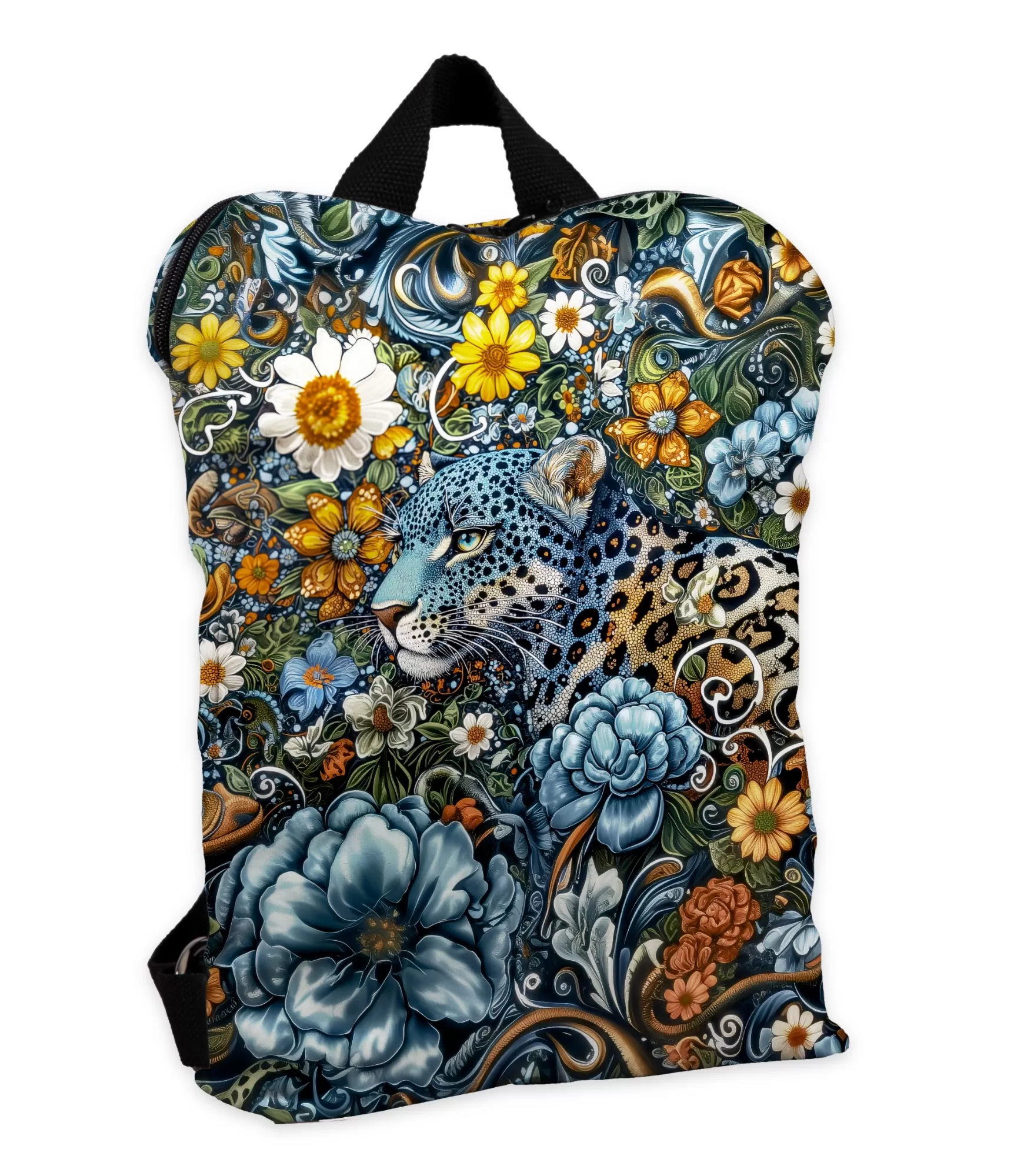 Nē, tas nav joks. Šis – savvaļas flora, kuras uzplaukums ir spēks, skaistums haosā. Zilajiem, brūnajiem, dzeltenajiem ziediem šeit nav nekāda sakara ar romantiku – tie sasaucas ar neparedzamo dabas ritmu, džungļu instinktu, kur dzīvo leopards. Katra līnija, katrs ritenis – kā vēja brāzma starp lapām. Tumšs fons, bagātīgas krāsas, grafiskā kompozīcija – ši mugursoma bez vārdiem runā par pašapziņu.