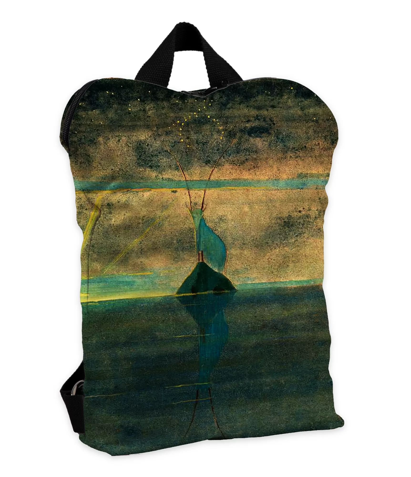 Kad mugursoma kļūst vairāk nekā tikai objekts – kad viņa sāk runāt par iekšējo spēku, pacietību un klusu apņēmību – tad tas kļūst par personīgo simbolu. Tieši tāda ir šsieviešuška mugursoma ar M.K. Čiurlioņa glezna „Saule iet Mežāža zīmē“ motīvs. Tas nav tikai aksesuārs – tas ir stāsts, kas jums nav jāuzņemas. Čiurlioņa darbu piepilda koncentrēšanās, iekšējs miers un savaldība. Tajā Mežāža zīme – kluss un spēcīgs – iemiesojas kā garīgs ceļš, kas cauri išpārbaudēm ved uz šgudrību. Attēlu krāsas – zemes toņi ar zelta zibšņiem – rada stabilu, bet ne vienmuļu noskaņu. Tas ir tāpat kā skatīties uz klusu kalnu, kas paceļas debesīs – tāds, kura virsotni var sasniegt, tikai pacietīgi kāpjot.