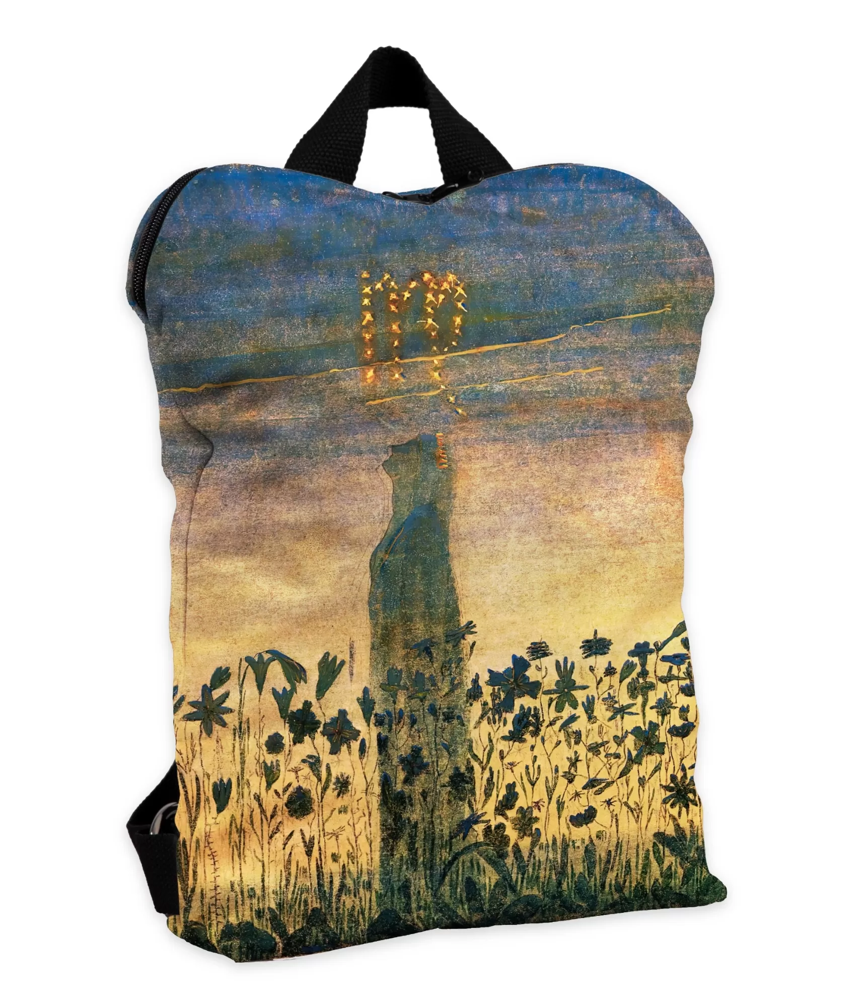 Mikalojus Konstantins Čiurlionis bija ne tikai mākslinieks, bet arī domātājs, kurš spēja saskatīt pasaules garīgo ritmu un nodot to tēlā. Viņa darbs „Saule iet zem Jaunavas zīmes“ – tas ir viens iš viņa Zodiaka cikla smalkākās daļas. Šeit Jaunava nav attēlota burtiski – tās būtība ir krāsa, gaisma un telpa. Šāda interpretācija ļauj mugursomai kļūt nevis par simbolu, bet gan emociju. Tas mums atgādina, ka pat ikdienas ceļā vai pastaigājoties pa pilsētu, mūs var ieskauj māksla.