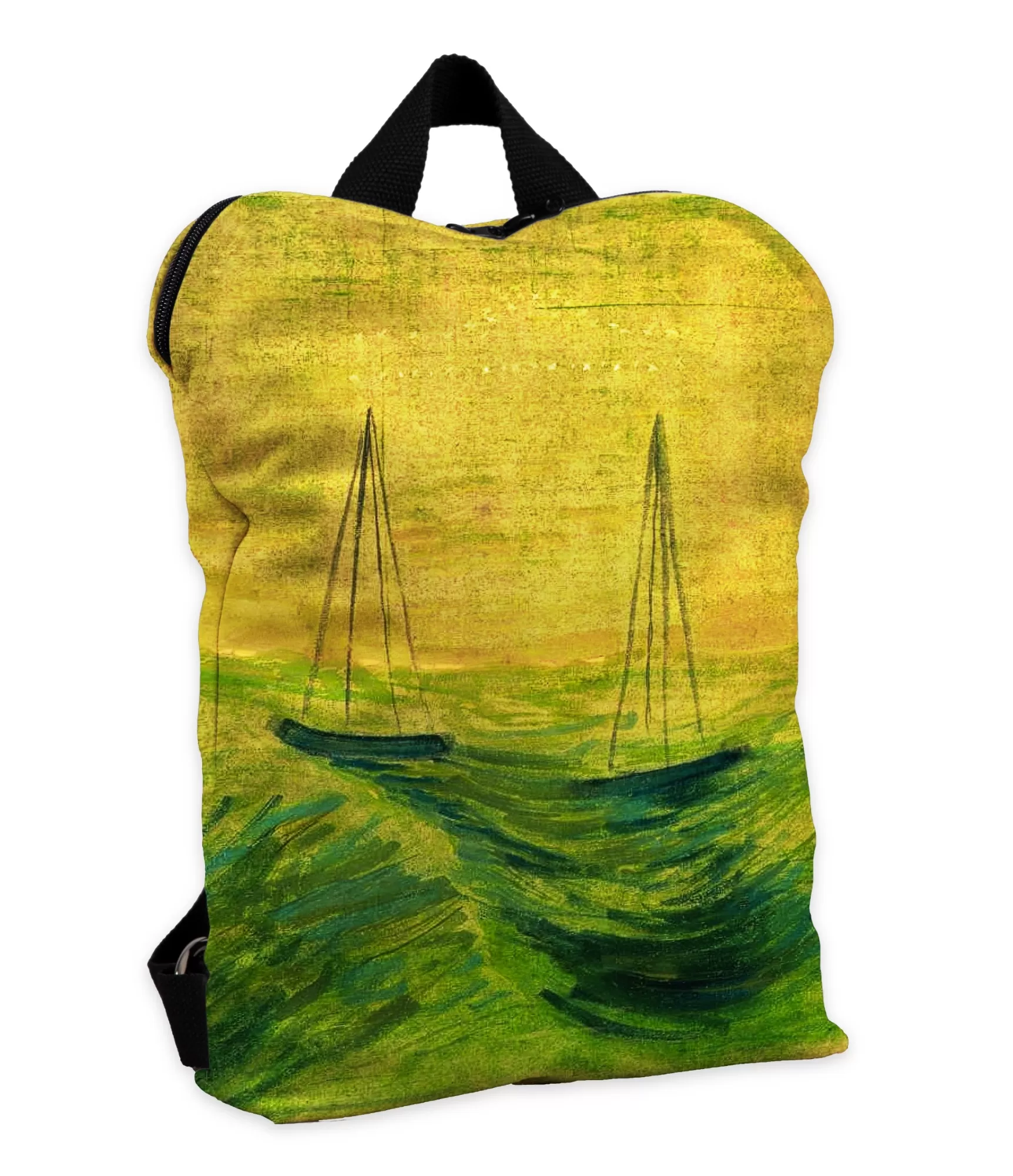 Uz mugursomas virsmas var redzēt velnišķīgi dzeltenzaļus un brūnus triepienus, it kā vakara saule lēnām grimtu aiz apvāršņa. Krāsu palete nav pārslogota – gluži pretēji, tas ir smalks, nomierinošs, piemērots gan rudenim, gan pavasarim. Skaņdarbs atspoguļo Čiurlioni redzējumu – sun gliding virš ainavas simbols, kas simbolizē Svaru zīmi. Klusa balansēšana starp divām pasaulēm, starp emocijām un saprātu, starp ikdienas dzīvi un garīgo pacēlumu. Šī ir šio mugursomas estētika – dziļa, bet pieejama ikvienam, kurš ir gatavs to sajust.