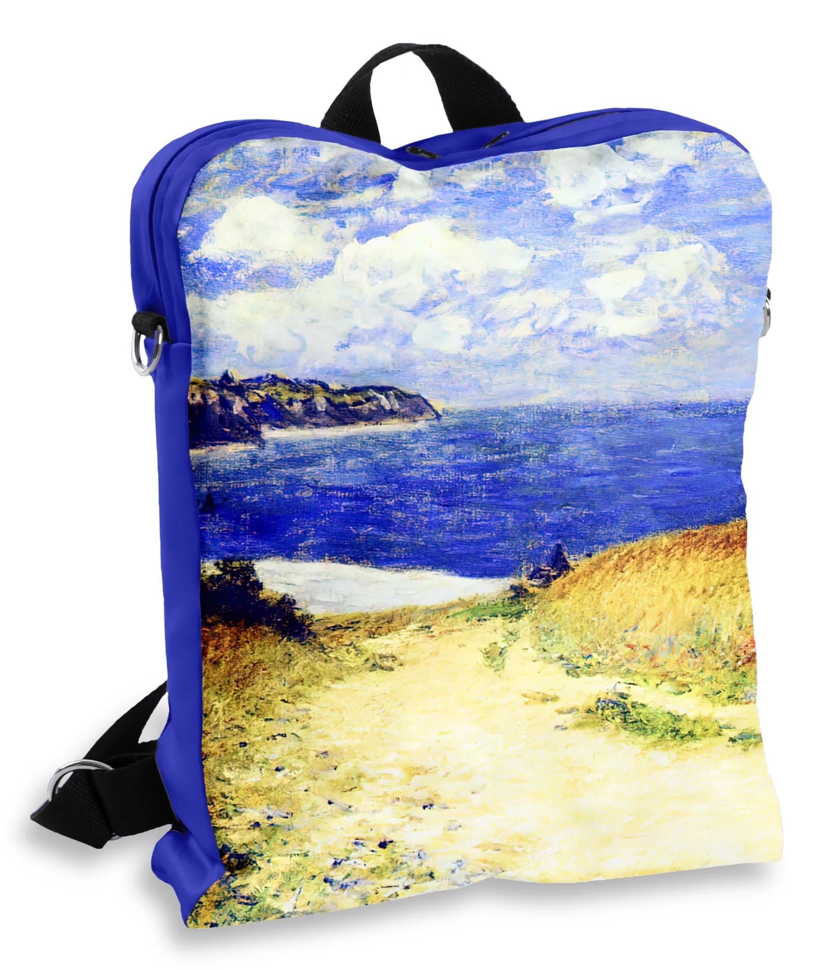 Kloda Monē glezna „Aleja pie Pūrvilas” kļūst par iedvesmu sievietes mugursomai, kas ir pilna ar vasaras siltumu un brīvību. Ššajā darbā ceļš ved ne tikai uz jūru – tas noved pie iekšējā stāvokļa. Stāvoklis, kurā gaiss ir piepildīts ar cerību un katrs solis ir piepildīts ar vieglumu. Un ši mugursoma ir tāda – ne tikai praktiski, bet arī emocionāli.