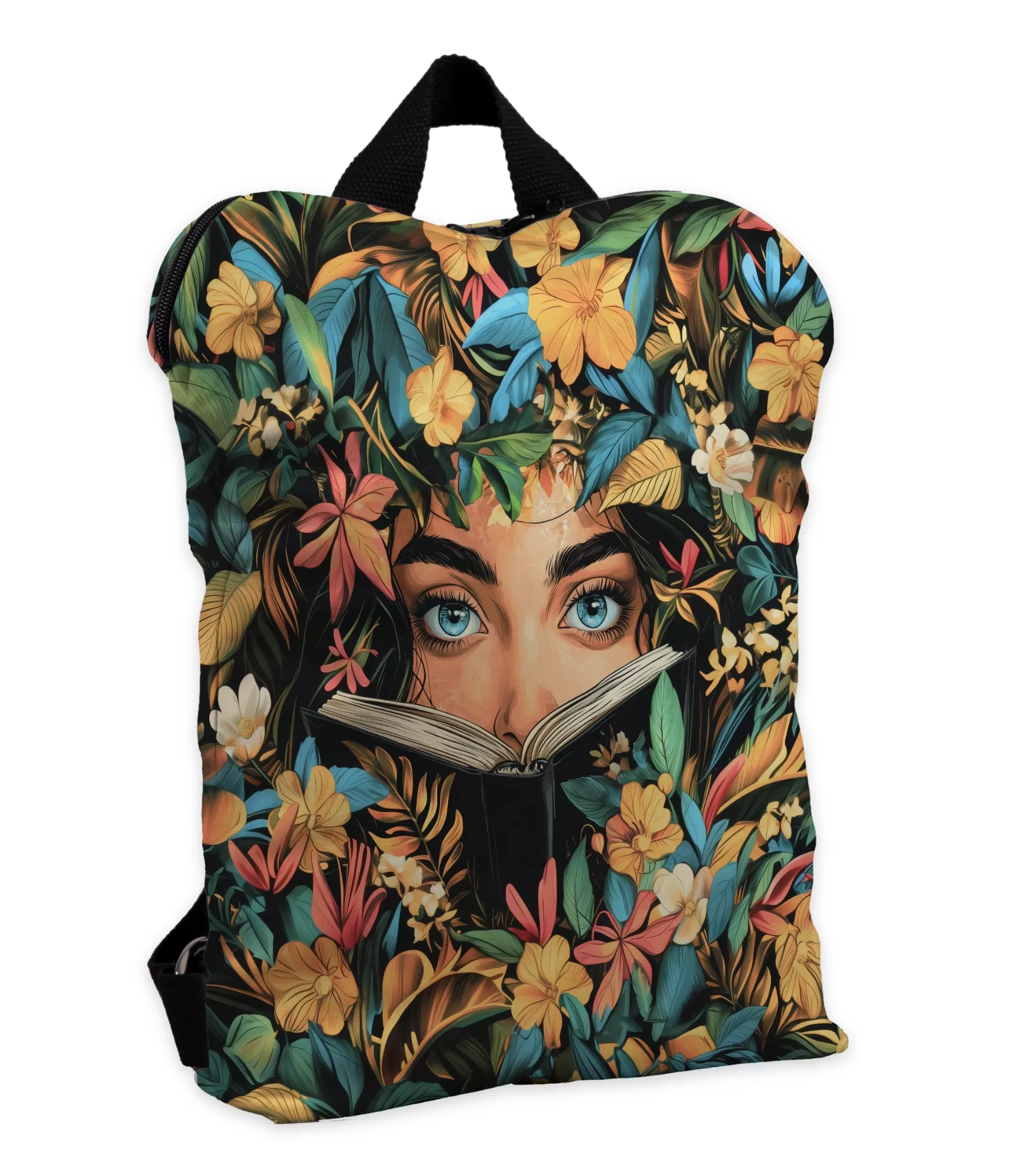Šsievietes mugursoma, it kā peldētu iš ilustrēta romāna vai pasakas, kur katra lapa ir pilna ar krāsām, smaržām un noslēpumainiem skatieniem. Koši zilas acis skatās tieši manī. grāmatu lappuses, it kā aicinot apstāties un ieskatīties dziļāk. Tos ieskauj ziedošs tropu ziedu dārzs – savīti zeltaini dzelteni, rozā, oranži un tirkīza ziedi, kas ne tikai aizpilda visu mugursomas fonu, bet arī kļūst par daļu no tās rakstura. Š dizains atgādina vecas grāmatu ilustrācijas – noslēpumaina, emociju pilna, ar saikni starp dabu un cilvēka iekšējo pasauli.