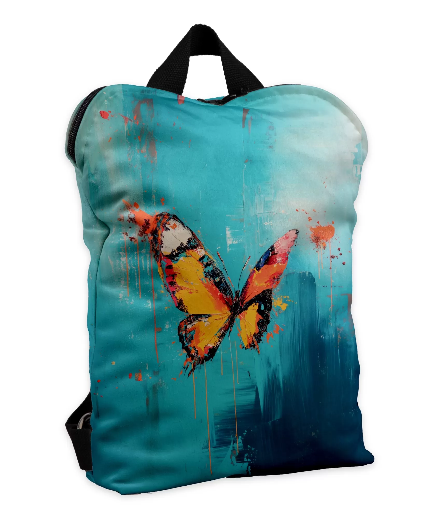 Ši unikālā mugursoma, šķiet, aicina jūs iekļūt krāsu virpulī. Spilgti oranžs tauriņš, kas lidoja virs dinamiskas tirkīza un zila fona, kļuva par sievietes mugursomas galveno akcentu. Dizains atgādina abstraktās mākslas triepienus: vaļīgi otas triepieni, noplūdusi krāsas faktūra un intensīvs krāsu kontrasts rada dzīvīgu, mūsdienīgu iespaidu. Tauriņa spārniņus apspēlē spilgti oranži un dzelteni toņi, ko papildina zilas un rozā detaļas – tas ir dizains, kas nebaidās tikt pamanīts. Tikmēr mugursomas forma išpaliek minimālistiska – bez papildu detaļām, ļaujot pilnībā pievērst uzmanību mākslinieciskajai kompozīcijai.