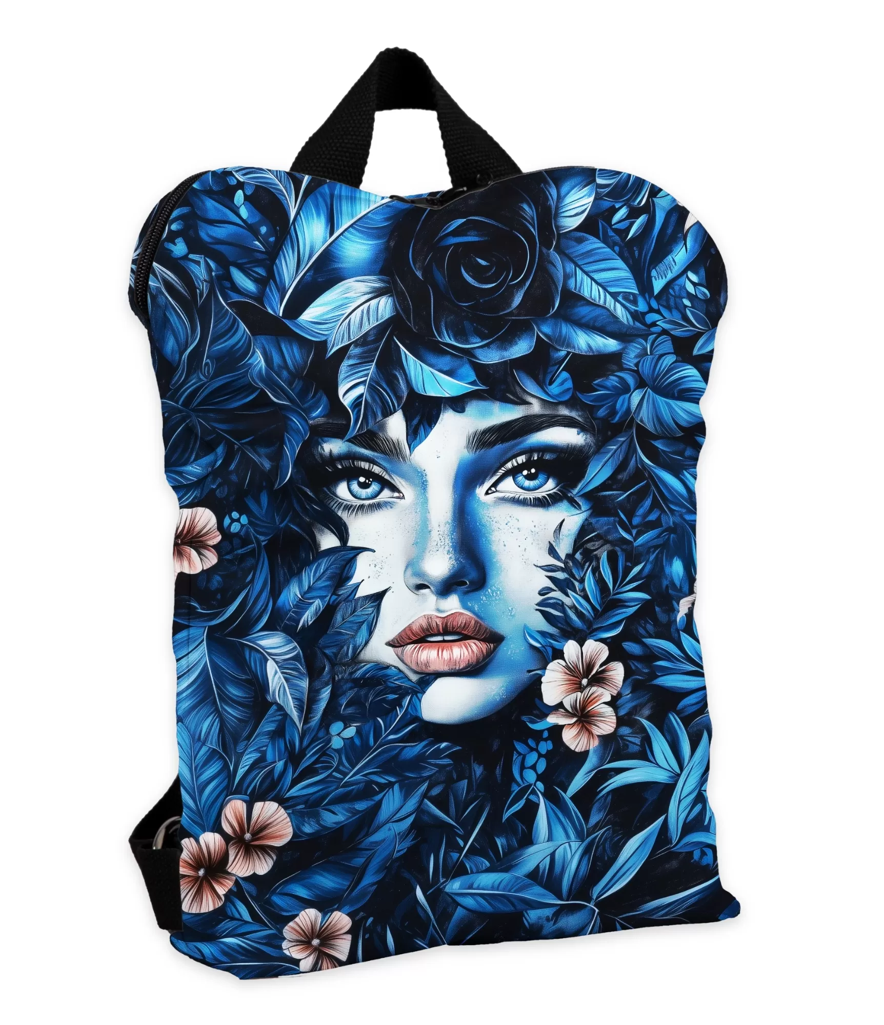 Ši mugursoma – tas ir vairāk nekā aksesuārs. Šis – mākslas darbs, kurā apvienots izteiksmīgs sievietes portrets un tropu ziedu noslēpums. Spilgti zilu toņu lapas apņem sievietes seju kā blīvi džungļi, iš kura intensīvās acis raugās it kā sargātu noslēpumu. Lūpas – švelnrozā, kontrastējot ar šzemākiem toņiem, un starp zilajām lapām negaidīti uzplaukst švelnrozā ziedi. Tas attiecas ne tikai uz estētiku, bet arī uz sajūtu – miers, noslēpums un iekšējais spēks.