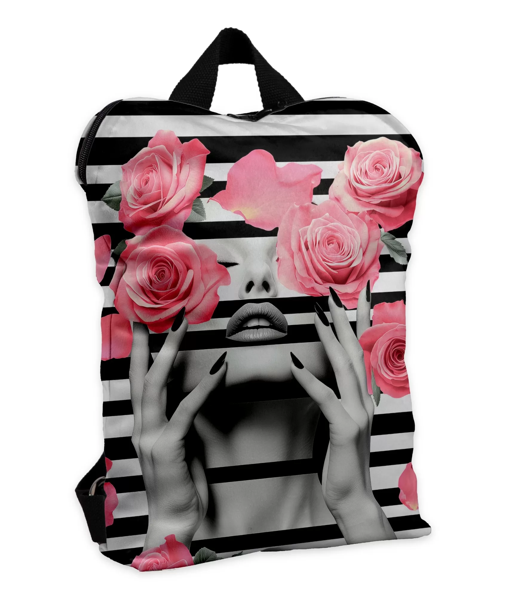 Sieviešu mugursoma – tas ir īsts mākslas darbs, kas apvieno kontrastējošu melnbaltu figūru ar intensīvi rozā rozēm. Melnbalto horizontālo līniju fons rada grafisku stingrību, kurā drosmīgi iekļūst spilgtas rožu galvas – kā emociju uzliesmojums virsū klusumam. Galvenā uzmanība – noslēpumaina sievietes seja ar aizvērtām acīm, spilgtām lūpām un garām melnām nagu līnijām – it kā turpinot attēlu citā dimensijā. Kompozīcija izskatās kā modes žurnāla vāks, atspoguļojot iekšējo spēku, jutekliskumu un radošo brīvību.