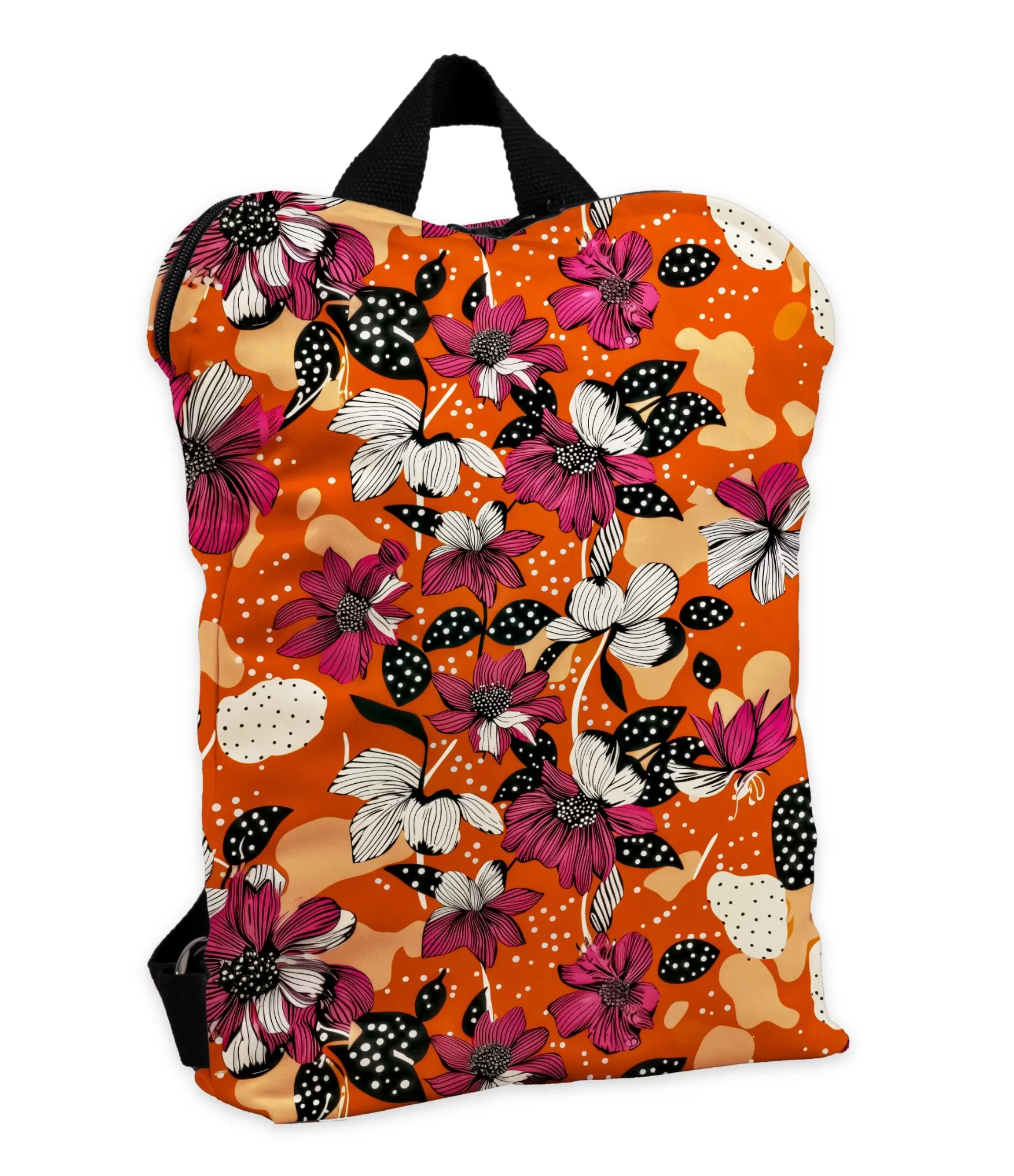 Šsieviešu mugursoma neatstāj vienaldzīgu – tā spilgtais dizains ir pilns ar vasaras enerģiju un māksliniecisku nojausmu. Fonā dominē piesātināta oranža krāsa un to rotā spilgti ziedu motīvi. Ziedi – it kā dzīvs, ar dziļi rozā ziedlapiņām, melniem centriem un kontrastējošām baltām un melnām lapām. Ši krāsu kombinācija – drosmīgs, bet harmoniski līdzsvarots, un mazās baltā riteņa detaļas (tašceļi un plankumi) piešķir rotaļīgumu. Tas viss rada sajūtu, it kā rokā būtu mākslas darbs, nevis vienkāršs aksesuārs.