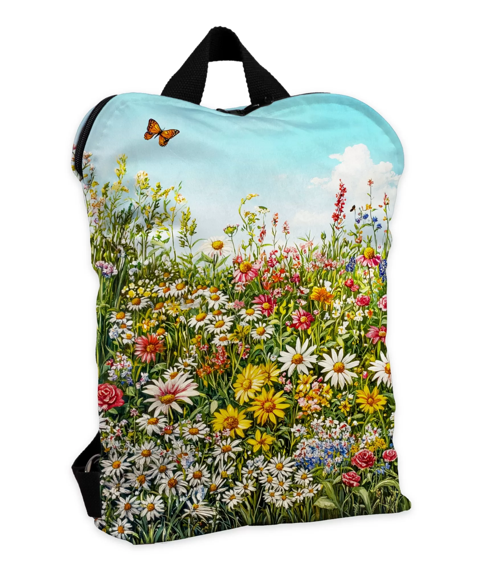 Iedomājieties rītu, kad basām kājām ejat pa rasainu pļavu, un katrs solis ir piepildīts ar ziedu smaržu. Tāda ir sajūta, kas rodas, skatoties uz mugursomu – it kā tu būtu apturējis vasaru un uzlicis to uz saviem pleciem. Šeit katra margrietiņa, magone, rudzupuķe un rudzupuķe izskatās kā ar mīlestību krāsota. Krāsas švelns, bet dzīvības pilnas – dzelteni, rozā, balti un zili ziedi šlabi kopā šzaļā krāsā.