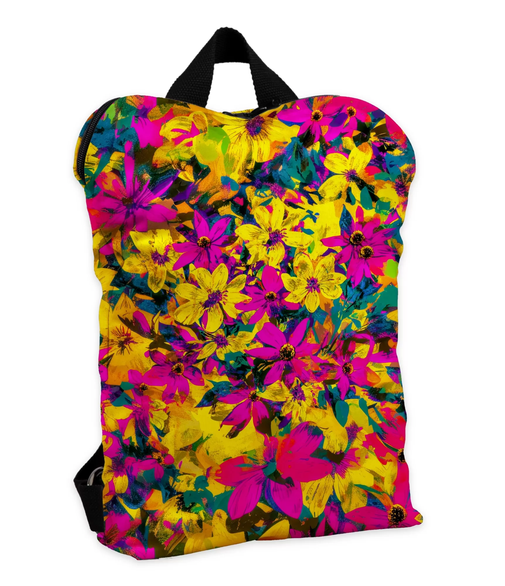 Ši mugursoma – tie nav ziedi, tā ir viņu šacs. Ne kluss, ne romantisks, bet vētrains, dzīvesprieka un vasaras brīvības pilns. Spilgti dzeltenais fons izstaro gaismu kā saule pusdienlaikā, un uz tā – fuksijas, purpursarkani, zili un zaļi ziedi iebrūk dienā bez atļaujas. Visa kompozīcija atgādina izteiksmīgu audeklu, gleznots plašiem triepieniem. Šī ir mugursoma sievietei, kura sagaida pasauli ar enerģiju un krāsām.
