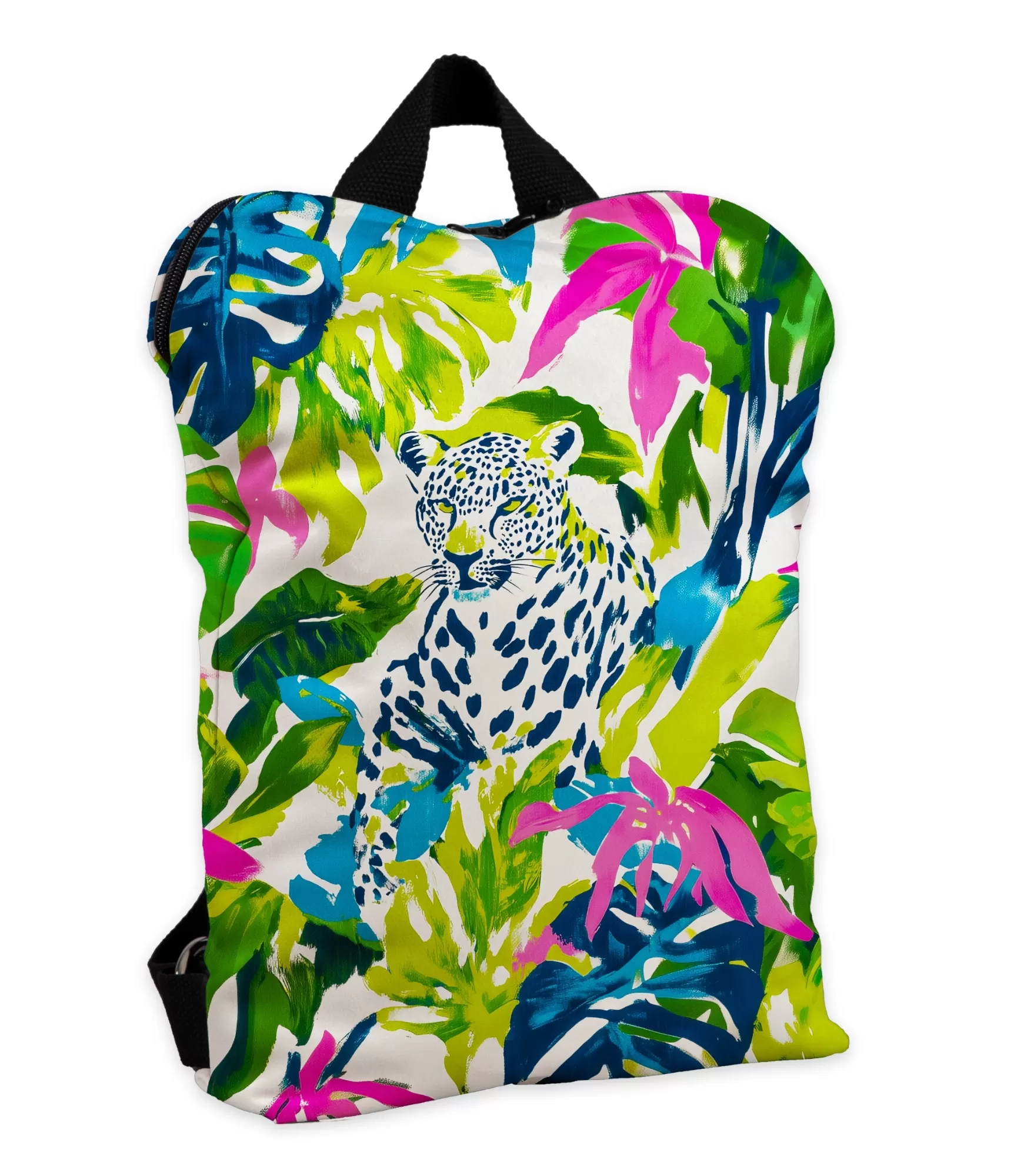 Džungļu biezokņos, kur katra lapa šķiet kā trieciens iš gleznotāja rokas, slēpjot mierīgu, bet uzmanīgu skatienu – leopards kā iš krāsains sapnis, kas skatās tieši uz tevi. Ši mugursoma – tas nav tikai aksesuārs, tas – ceļojuma noskaņa, tropisks stāstījums, kas katru rītu atgādina par mežonīgu brīvību, krāsu drosmīgumu un individualitātes spēku. Šeit nav pelēko toņu – tā vietā ir sprādziens augļu rozā, spilgti zaļā, dziļi zilā un ziedošā zaļā krāsā, it kā lēkājot starp tropiskām lapām un eksotiskiem ziediem.