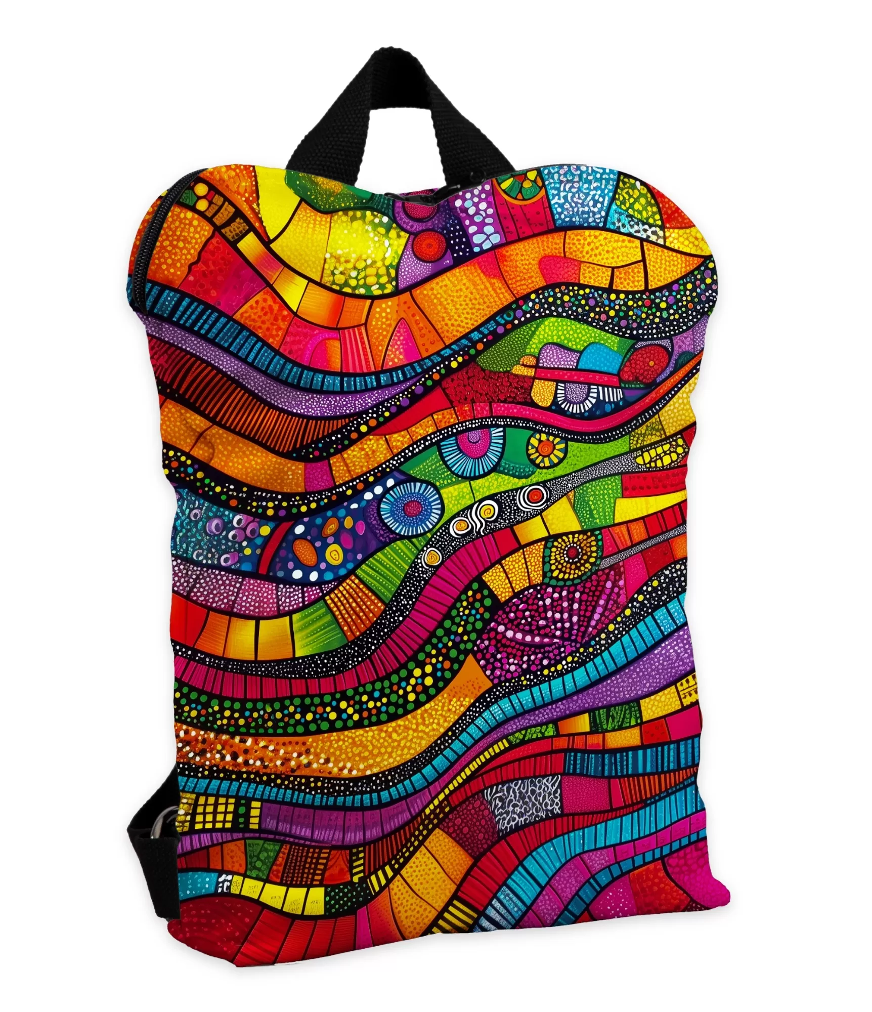 Sieviešu mugursoma – kā krāsu simfonija, pārvērsta par ikdienas pavadoni. Tiklīdz paskatās uz to, jūsu acis iegrimst krāsaino viļņu acī, ko savieno dzelteni, rozā, oranži, zili, zaļi un violeti pavedieni – viss pulsē ar dzīvību un radošumu. Katrs segments ir krāsots ar dažādiem punktiem, ornamentiem, līnijām, it kā iedvesmojoties no Gustava Klimta vai Laurel Burch stila. Krāsu plūsmas plūst kā upe, nenesot sev līdzi emocijas, ritmu, noskaņu.