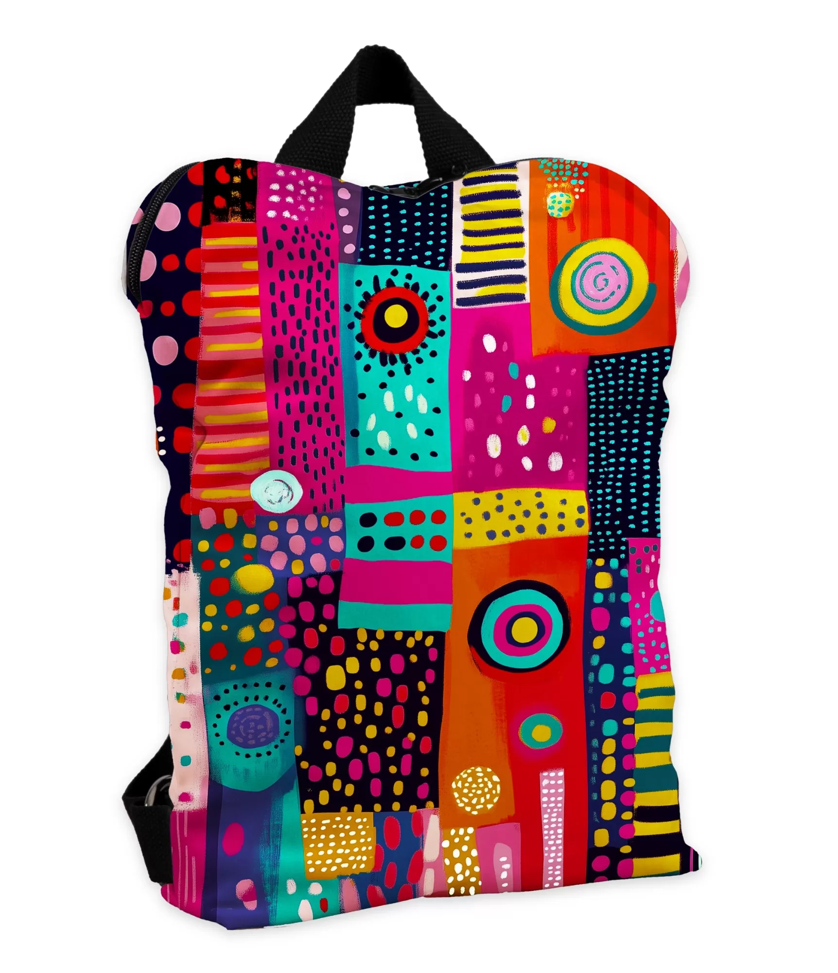 Ši mugursoma ir kā krāsu sprādziens, kas nav nēsāts uz pleciem. Uz tās virsmas izvēršas spilgti fuksijas, tirkīza, dzeltenie, sarkanie un violetie toņi, kas ir krāsoti ar spontāniem punktiem, līnijām un ģeometriskām figūrām. Dizains atgādina modernās mākslas gleznu – kā sadrumstalota audekla glezna, kur katram plāksterim ir savs ritms un emocijas. Tā ir mugursoma, kas piesaista uzmanību un aicina apstāties, ieskatīties vērīgāk, padomāt vai vienkārši pasmaidīt. Viņas kompozīcija ir improvizācijas pilna – kā mūzikas ieraksts iš krāsas. Viena mugursomas puse ir dekorēta ar velnišķīgi baltu materiālu, kas kontrastē ar krāsaino mākslu otrā pusē. Tā ir ši divpusējā išraiška, kas rada harmonisku līdzsvaru – starp haosu un mieru.