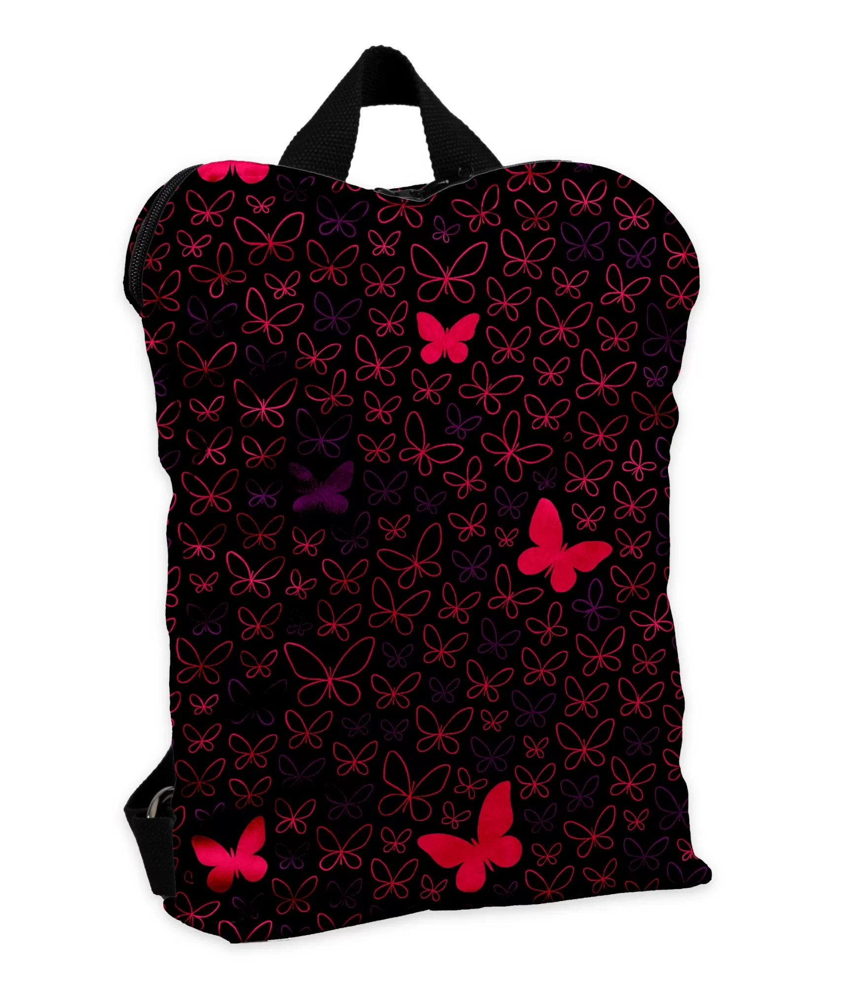 Sieviešu mugursoma – tas ir kā šziedošs tauriņu dārzs uz tumsas fona. Uz melnā fona lido šārkārtīgi elegantišs, smalki izkārtoti tauriņi – no šsarkanā līdz bagātīgām purpursarkanām nokrāsām. Daži no tiem – piemēram, išryšinsulti – ryš īsāki, lielāki, it kā viņi gribētu lidot iš audums. Dizains padara mugursomu ne tikai rotaļīgu, bet arī unikālu – kā aksesuārs, kas uzreiz iekrīt acīs. Dizains rada iespaidu, ka tauriņi peld gaisā, liekot ikvienai sievietei vai meitenei justies kā daļai no pasakas. Šis nav parasts ritenis – tā ir kompozīcija, kas atgādina par vieglumu, brīvību un sievišķību.