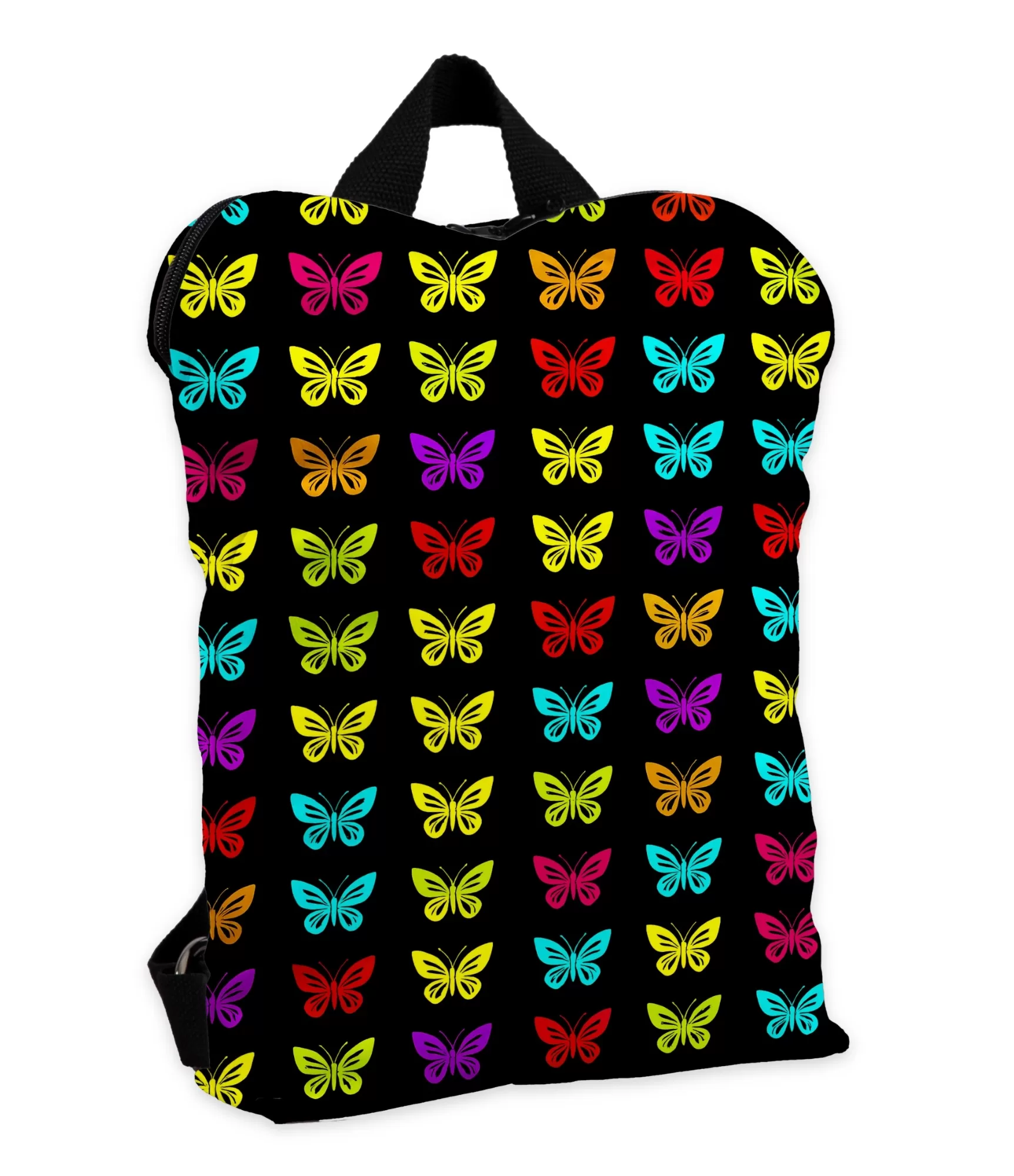 Sieviešu mugursoma – tā ir stila un krāsu palete ikvienam, kurš vēlas izcelties un nepalaist garām sauli pat mākoņainā dienā. Melnais fons šeit kļūst par ideālu pamatu krāsu eksplozijai: glīta, stingra kompozīcija iš krāsainie tauriņi rada hipnotisku, rotaļīgu un tajā pašā laikā ārkārtīgi stilīgu iespaidu. Krāsas – Dziļi violeta, sārtināta sarkana, neona dzeltena, oranža, elektriskā zila, velna ceriņi – išsakārtota simetriski, tāpēc mugursoma izskatās harmoniska, nevis haotiska. Katrs tauriņš ir kā simbols – par vieglumu, kustību un drosmi būt pašam.