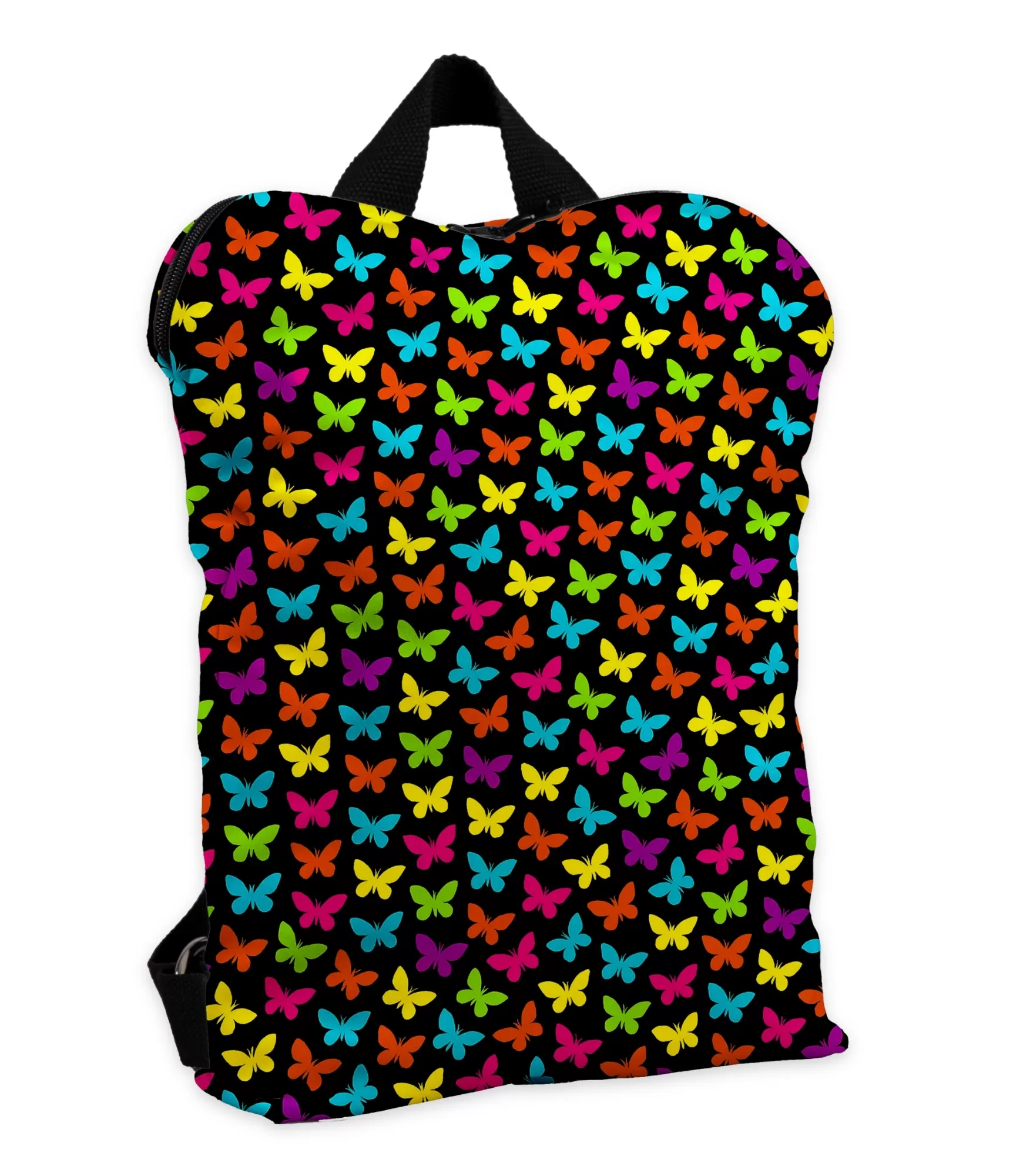 Kā daudzkrāsaina vasaras pļava – Sieviešu mugursoma vienmēr piesaista uzmanību ar savu drosmīgo un optimistisko estētiku. Šķiet, ka uz melna fona gaisā peld krāsaini tauriņi: oranži, fuksijas, zili, zaļi, dzelteni – viņu spārni pulsē ar enerģiju un prieku. Katrs tauriņš ir kā mazs sapnis, kas atbrīvojas, tiklīdz paskatās uz dizainu. Simetriskas formas rada ritmu, un bagātīgas krāsas spīd kā gaismas tumsā. Ši skaņdarbs izstaro gan rotaļīgumu, gan iekšējo spēku – it kā sieviete ir drosmes, kustības, neatkarības manifests.