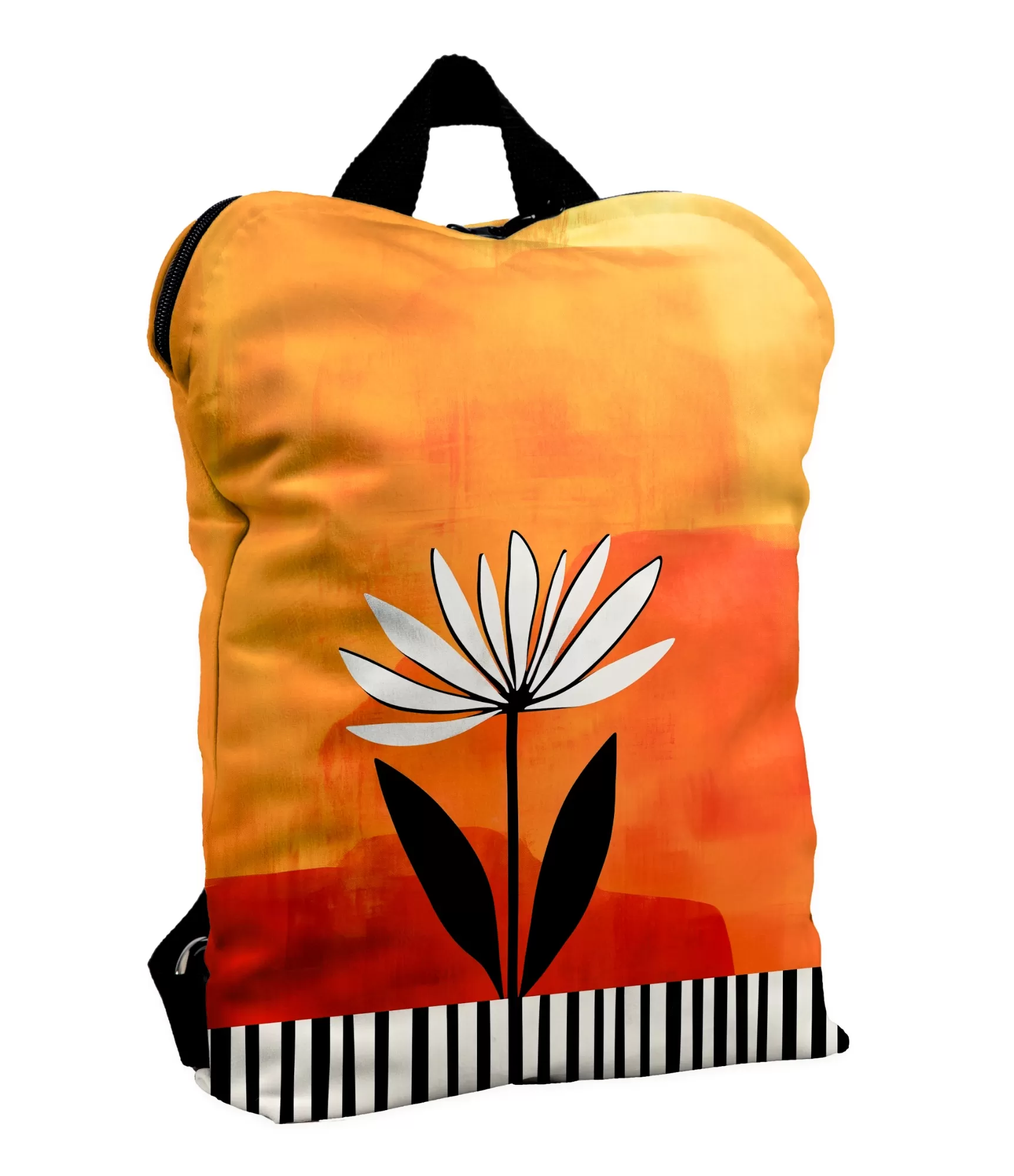 Kad rīts tikai mostas un saule vēl nav uzlēkusi virš pilsētas jumtiem, ši mugursoma jau izstaro savu oranžo šarmu. Viņas fons – kā šass triepiens pāri akvareļa debesīm, kur dzeltens, persiks un oranžs sajaucas kopā. Taču visu vainago viens motīvs – kā stilizēts zieds, ar baltām ziedlapiņām un tumšām, skaidrām līnijām. Tas drosmīgi, lepni stāv uz melnbaltas svītrainas joslas, kas atgādina skatuves malu, it kā aicinot jūs ar pārliecību ieiet savā dienā.