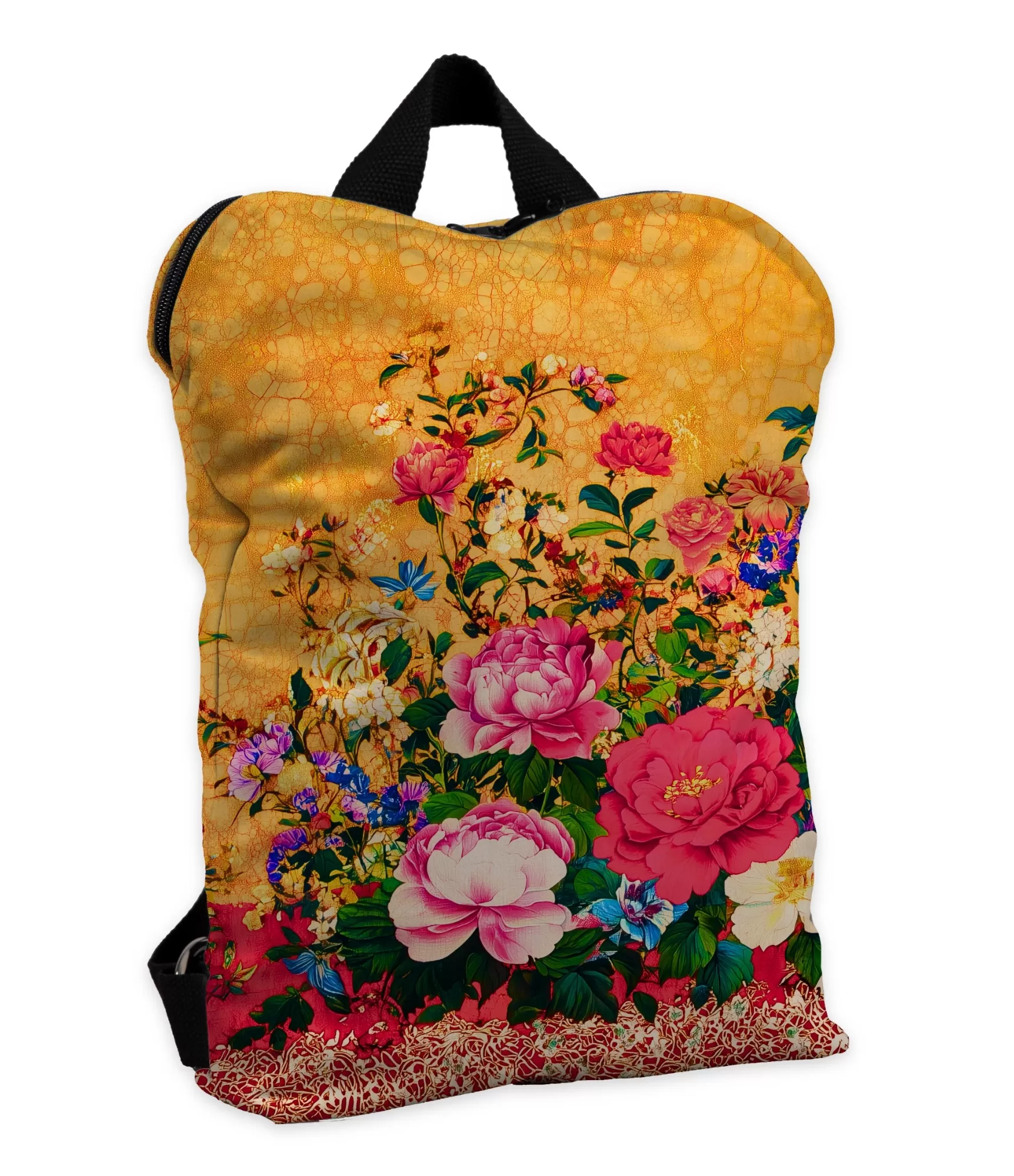 Šsieviešu mugursoma izskatās kā ar roku krāsota – katram ziedam šeit ir savs raksturs, katrs tonis stāsta stāstu. ŠAsais zeltainais fons atgādina novecojušu Šādas audumu, smalki plīst kā šķelts porcelāns. Uz tās zied bagātīgas rozes, peonijas, spilgti zili violeti ziedi – tas viss saplūst unikālā kompozīcijā, it kā gleznotu meistara, kurš lieliski pārzina krāsu dramaturģiju. Spilgtā, it kā izšūtā floras pasaule kļūst ne tikai par dizainu, bet arī par noskaņojumu, ko negribas katru dienu.
