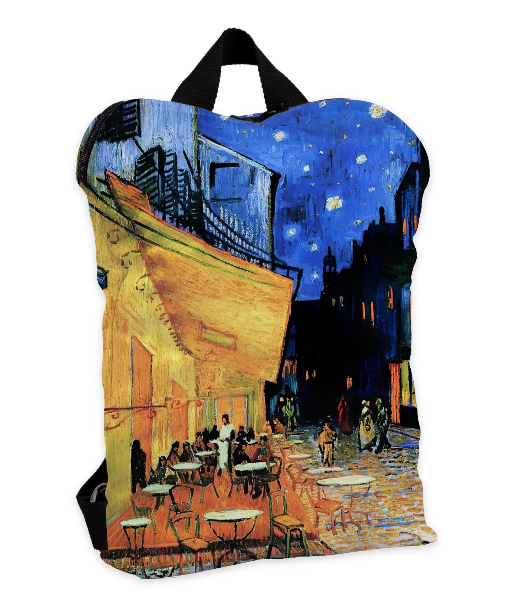 Šajā darbā Van Gogs uzgleznoja nakts ainu bez melnās krāsas – tā vietā viņš izvēlējās zilās, purpursarkanās, dzeltenās krāsas, kas šeit saplūst harmoniskā stāstījumā. Mugursomas virspusē redzama dzeltenīgi izgaismota terase, teksturēts bruģis, kafejnīcā sēdoši cilvēki. Kompozīcija atveidota ar mīlestību pret detaļām: no ēku fona līdz debesu zilumam, kur mirdz pirmās zvaigznes. Tas viss ienesīs nakts prieku tieši jūsu rokās.