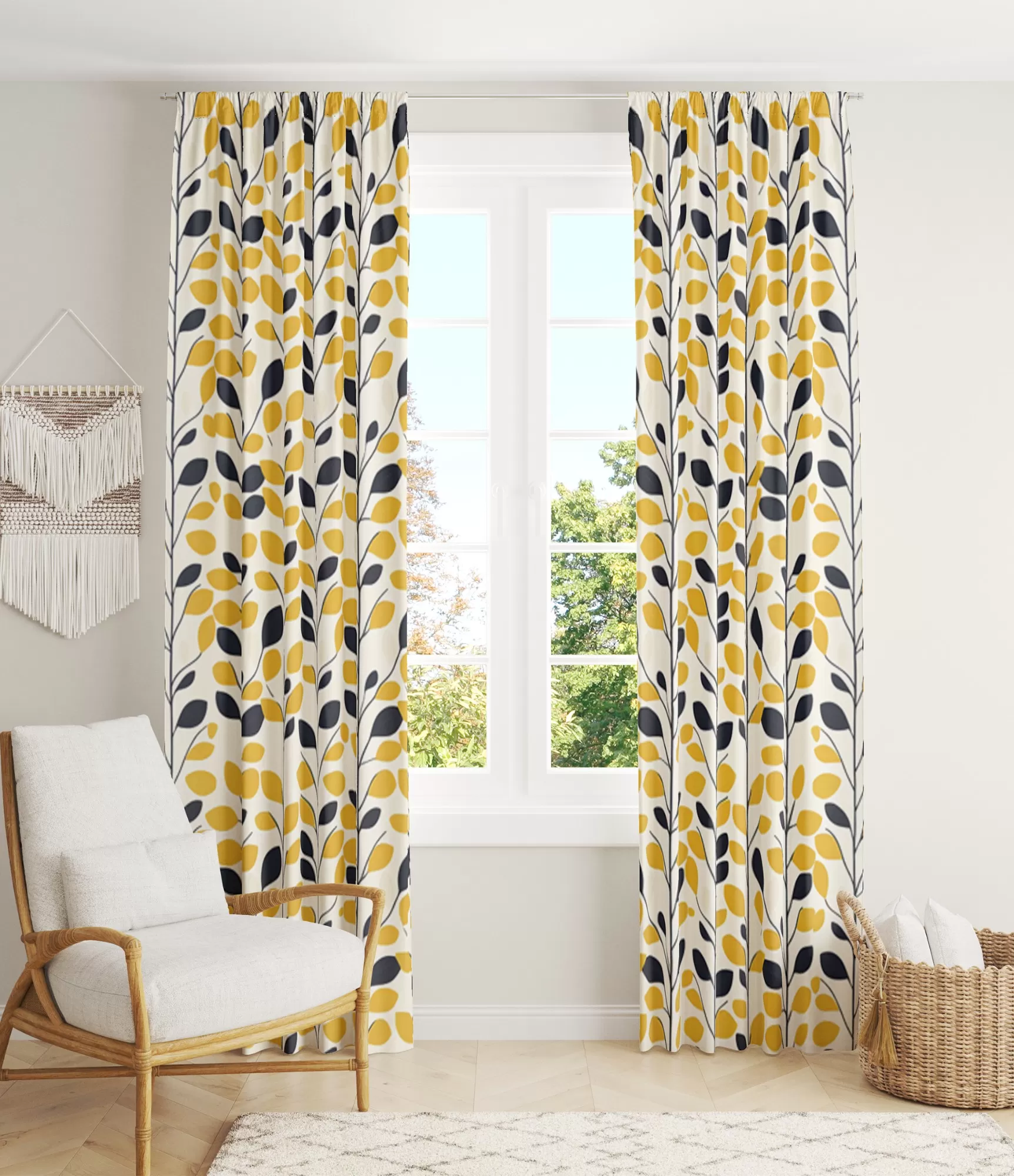 Nakts blackout aizkari ar ritmisku ziedu rakstu ir lieliska izvēle tiem, kas vēlas apvienot praktiskumu un estētiku savās mājās. Šie aizkari, dekorēti ar elegantiem ziedu motīviem, izceļas ar bagātīgu dzeltenās un melnās krāsas kombināciju, kas kontrastē ar pienbaltu fonu. Šāds dizains ne tikai piešķir telpai stilu, bet arī lieliski papildina gan modernu, gan skandināvu stila interjeru.