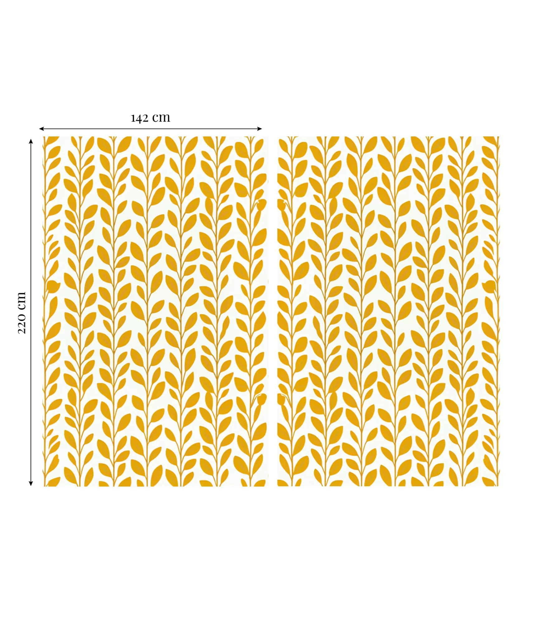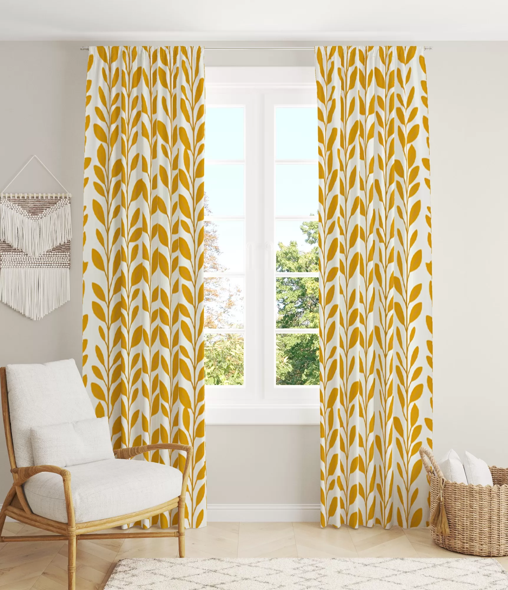 Šie nakts aizkari izceļas ar vienkāršu, taču īpaši izsmalcinātu dizainu – vertikāli izvietotas stilizētas zelta dzeltenas lapas, kuru forma ir nedaudz abstrakta. Lapu raksts uz tumša fona rada rafinētu un greznu izskatu, piešķirot telpai mierīgu, siltu un elegantu noskaņu. Raksts vienmērīgi atkārtojas abās aizkaru daļās, nodrošinot harmonisku un līdzsvarotu tēlu, kas lieliski piemērots nakts telpai.