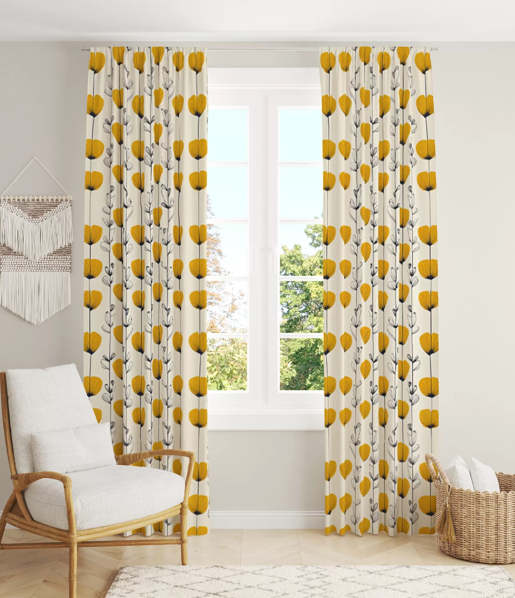 Šie nakts aizkari ir smalka skaistuma un retro elegances kombinācija, kas lieliski piemērota guļamistabai vai citām telpām, kur nepieciešama tumsā radīta gaismas un mājīguma spēle. Nelieli oranži un tumši brūni/melni ziedu motīvi, kas sakārtoti gandrīz kaleidoskopiskā rakstā, maigi izvēršas uz gaiši smilškrāsas fona. Stilizēti un abstrakti ziedu un lapu raksti ne tikai uzsver dabas skaistumu, bet arī pievieno retro un vintage akcentus, radot siltu un mājīgu sajūtu.