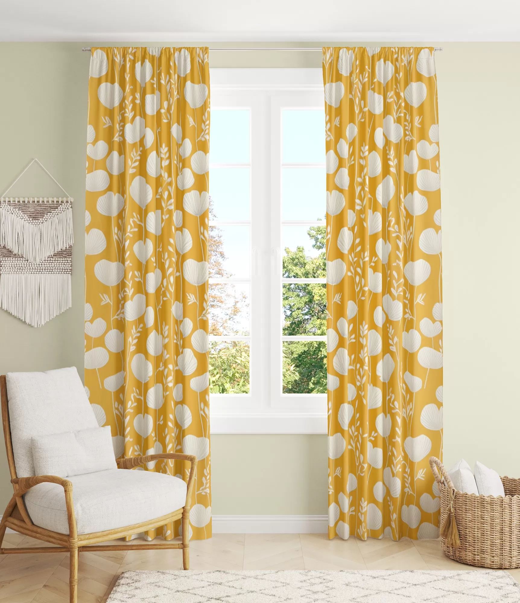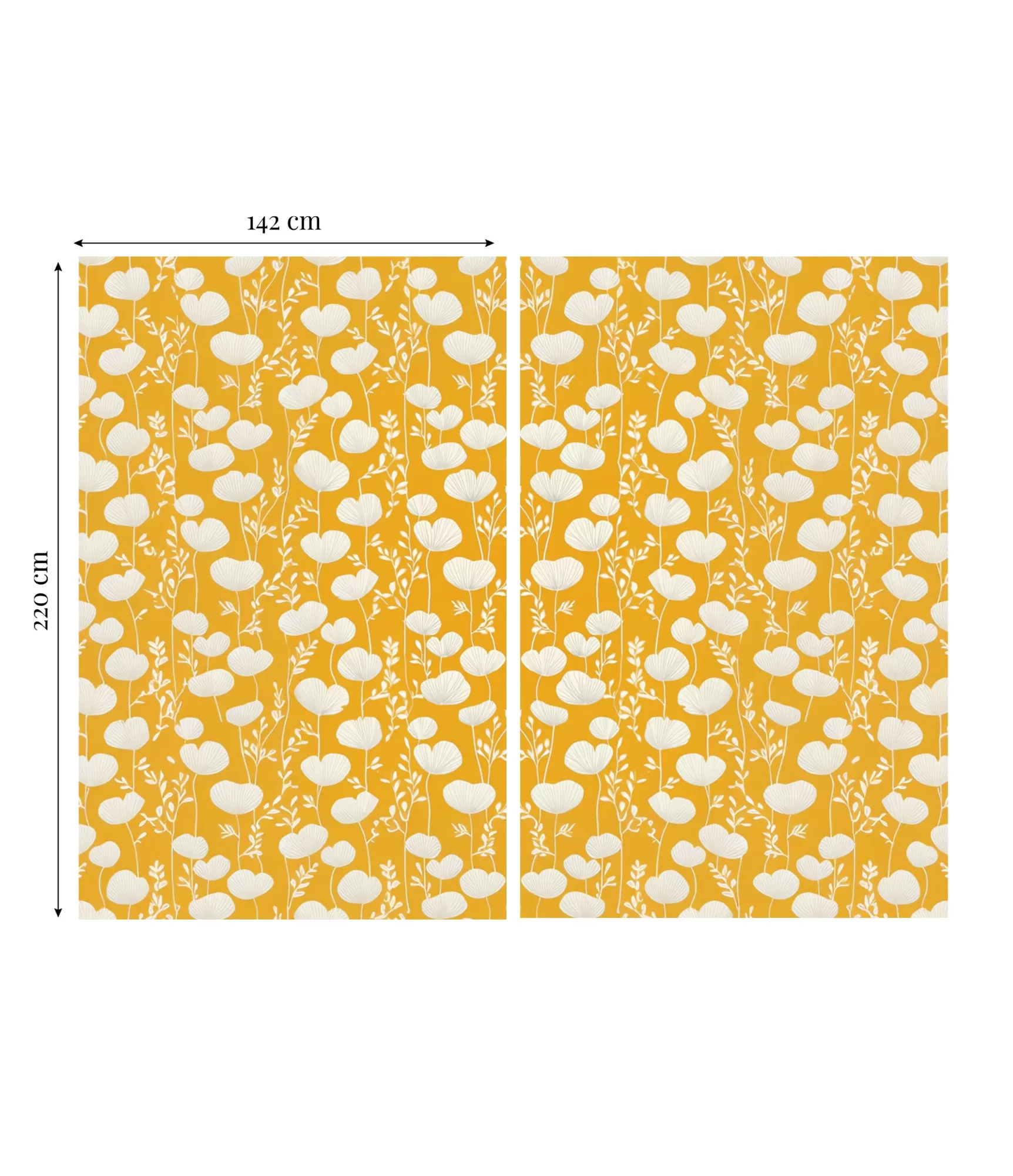 Šie nakts aizkari ir lielisks modernās elegances un retro šarma apvienojums, kas piešķir mājām gaismu un mājīgumu. Delikāts dizains ar stilizētiem baltajiem mago ziediem un maziem lapiņām, kas izkārtojas uz tumši dzeltena fona, ne tikai izgaismo telpu, bet arī ienāk mieru un rada komfortu un harmoniju. Vienkāršās un abstraktās ziedu formas piešķir siltu, gaišu un romantisku atmosfēru, ideāli piemērotu gan moderniem, gan klasiskā stila interjeriem.