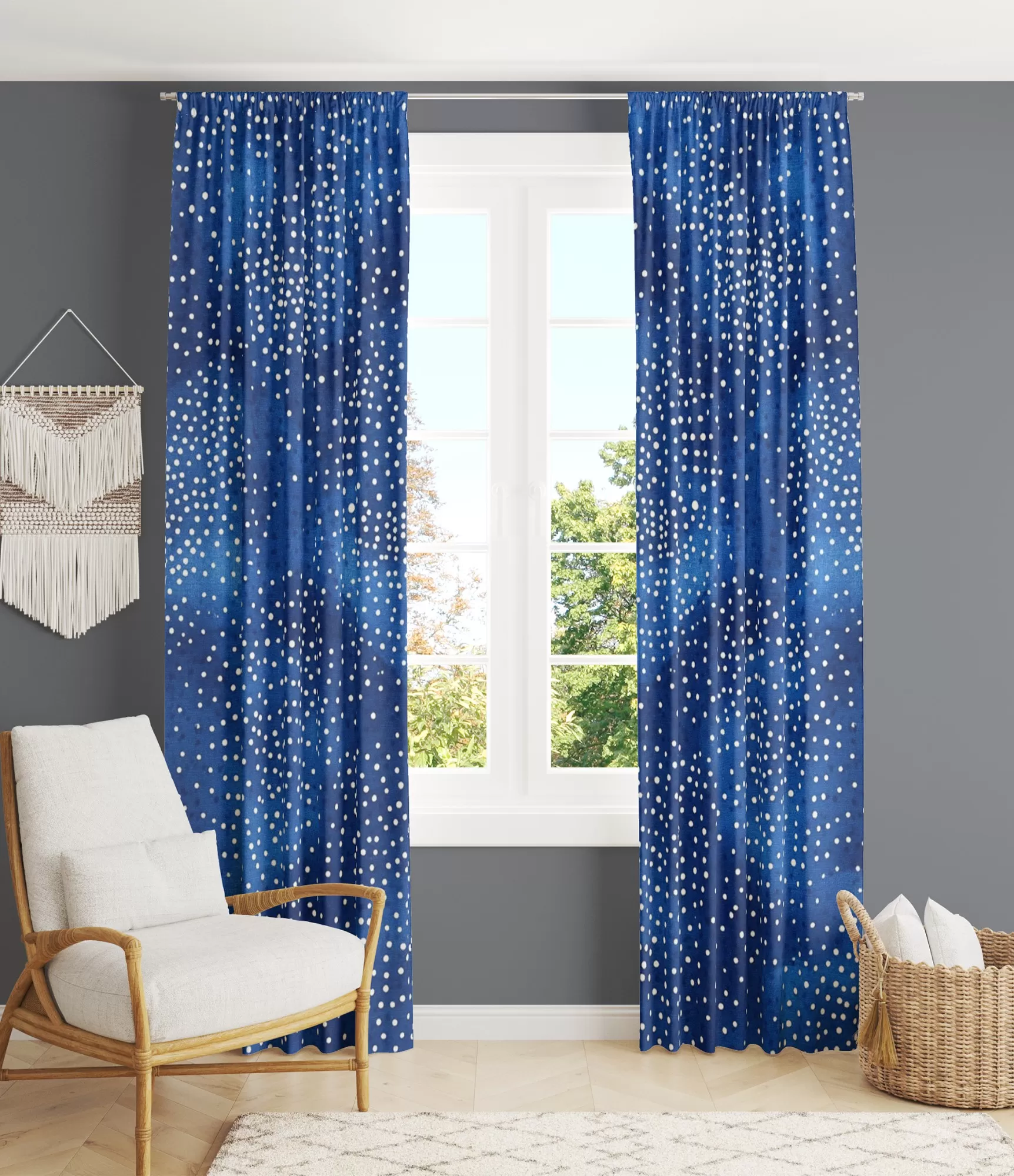 Spilgti zili aizkari ar baltiem punktiem ir lieliski piemēroti jūsu guļamistabas interjeram, radot nakts debesu ilūziju. Tie piešķir telpai rotaļīgumu, bet saglabā nomierinošu un mājīgu atmosfēru. Šie aizkari lieliski sader ar minimālisma vai skandināvu stila interjeru, kur dominē gaišas un neitrālas krāsas, un zilā kļūst par spilgtu akcentu. Zvaigznītēm līdzīgie punkti piešķir smalku tekstūru un mazliet dinamismu. Šādi aizkari var būt arī lielisks kontrasts ar baltām vai pelēkām sienām, piešķirot telpai dzīvību un enerģiju.
