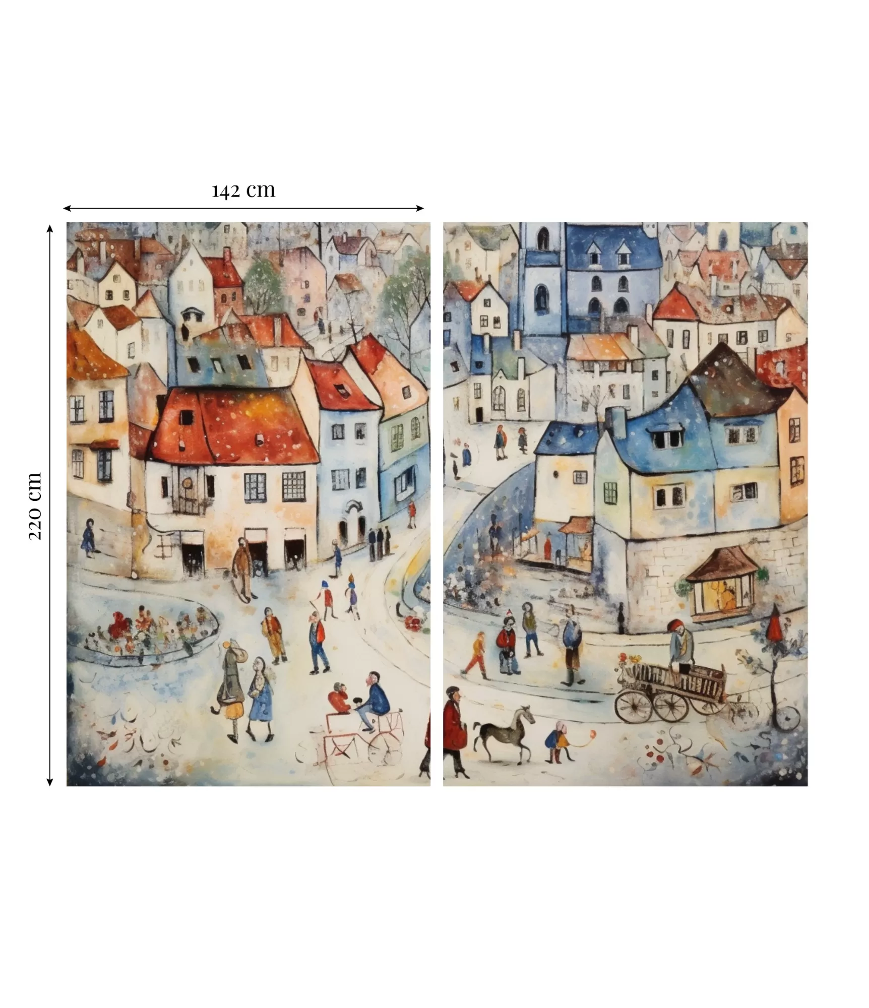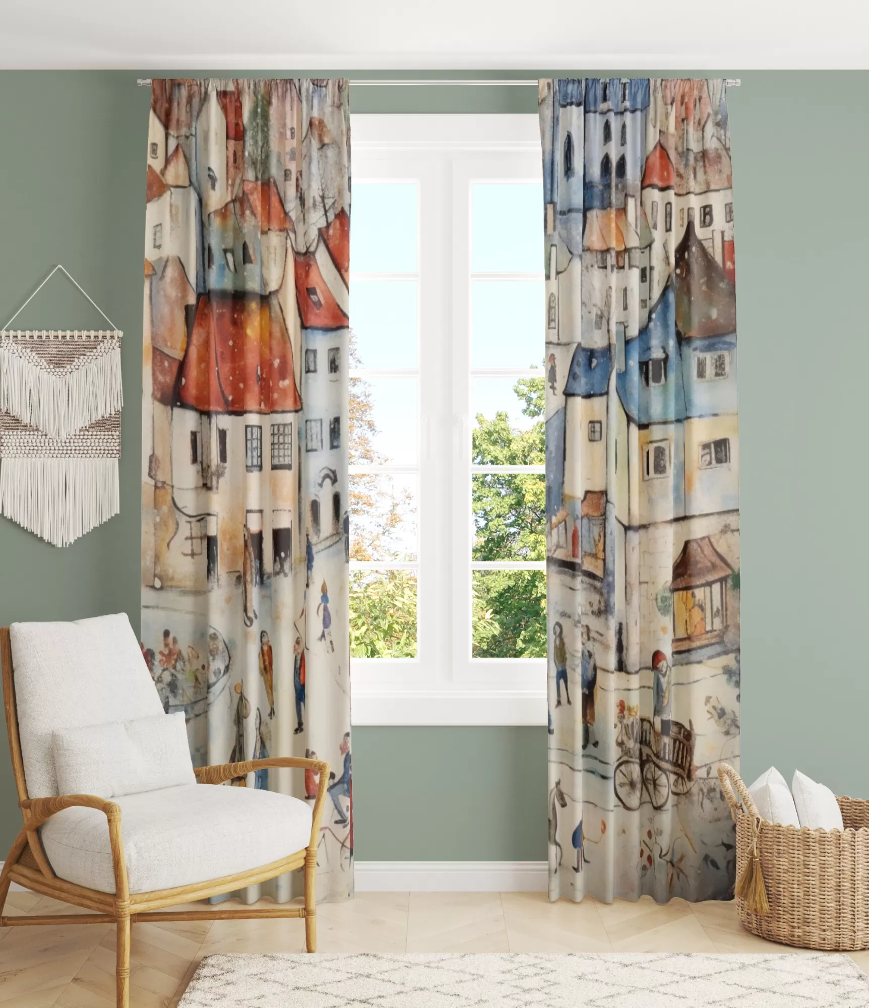 Gaišs zils fons atklāj apsnigušu, ziemīgu un mājīgu pilsētu ar sniegotiem jumtiem un laimīgiem cilvēkiem. Šie aizkari rada svētku noskaņu un mierīguma sajūtu mājās. Turklāt šie aizkari ir praktisks risinājums, jo tos viegli var mazgāt veļas mašīnā.
