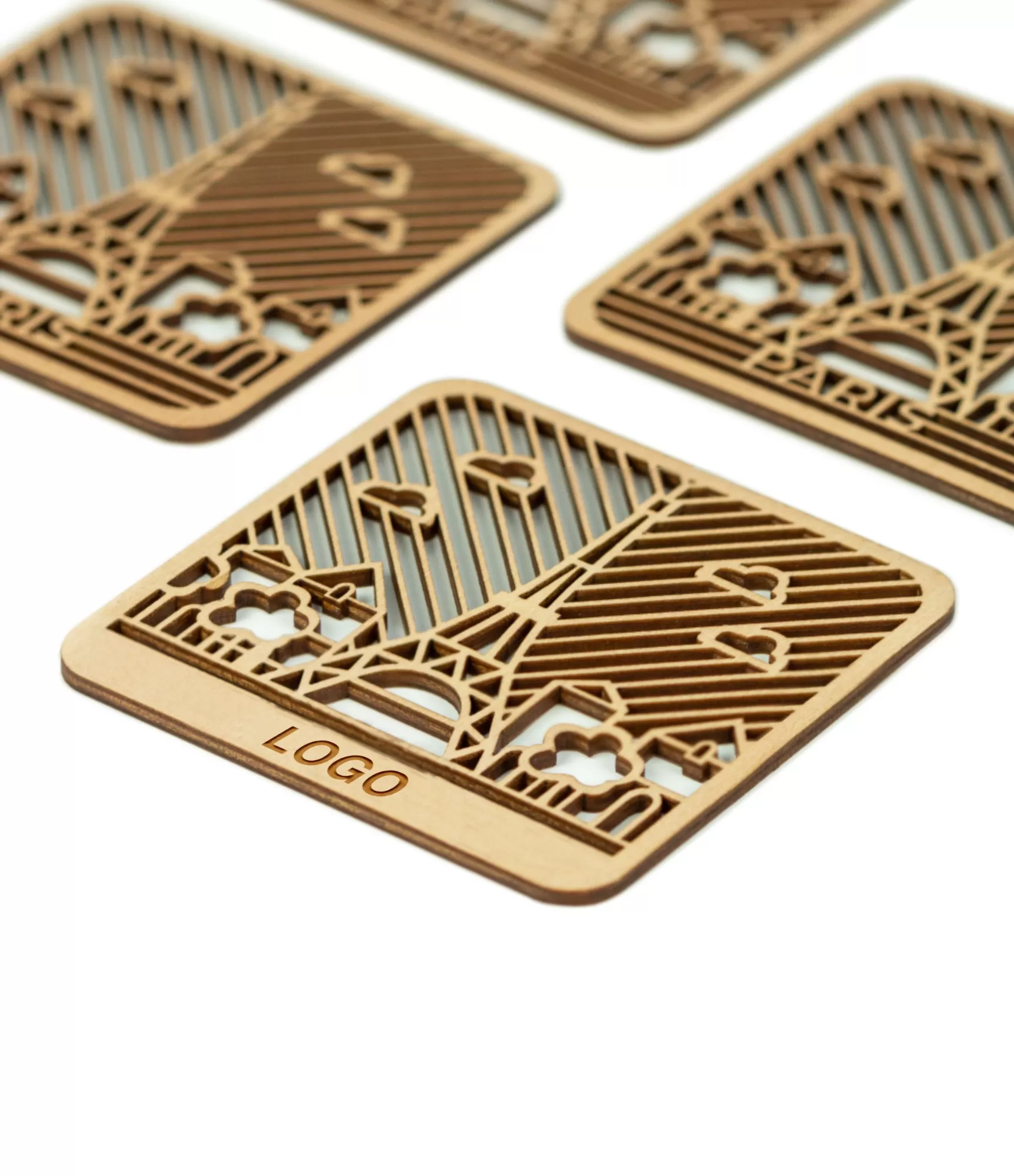 2 gab. koka paliktņu komplekts. Divu vienādu, kvalitatīvu bērza saplākšņa paliktņu komplekts. Izmēri: 10 x 10 cm. Biezums: ~3 mm. Vienā paliktņa pusē var iegravēt jūsu uzņēmuma logotipu, šfermu vai citu dizainu, kas piešķir dāvanai išatšķirību.