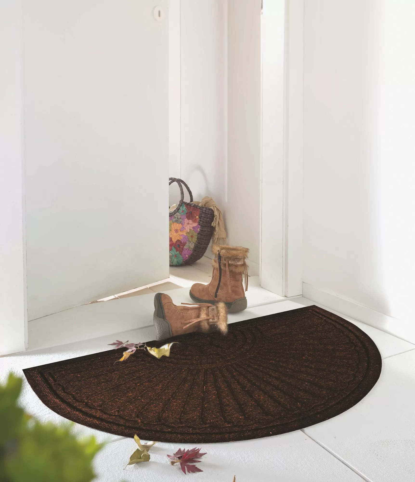Šis augstas kvalitātes mazgājamais āra paklājs piedāvā tumši brūnu toni, kas piešķir eleganci un izsmalcinātību jūsu āra telpai. Paklājs ir pusmēness formas, kas padara to ideāli piemērotu novietošanai pie ieejas durvīm, piešķirot zonai smalku atšķirību. Izgatavots no izturīga un laikapstākļiem izturīga materiāla, paklājs saglabā savu izskatu pat ilgstošas lietošanas laikā. Tā virsma ir viegli tīrāma, nodrošinot vienkāršu apkopi un saglabājot paklāju kārtīgu un tīru. Tas ir praktisks un stilīgs risinājums, kas uzlabos jebkuru āra vidi.