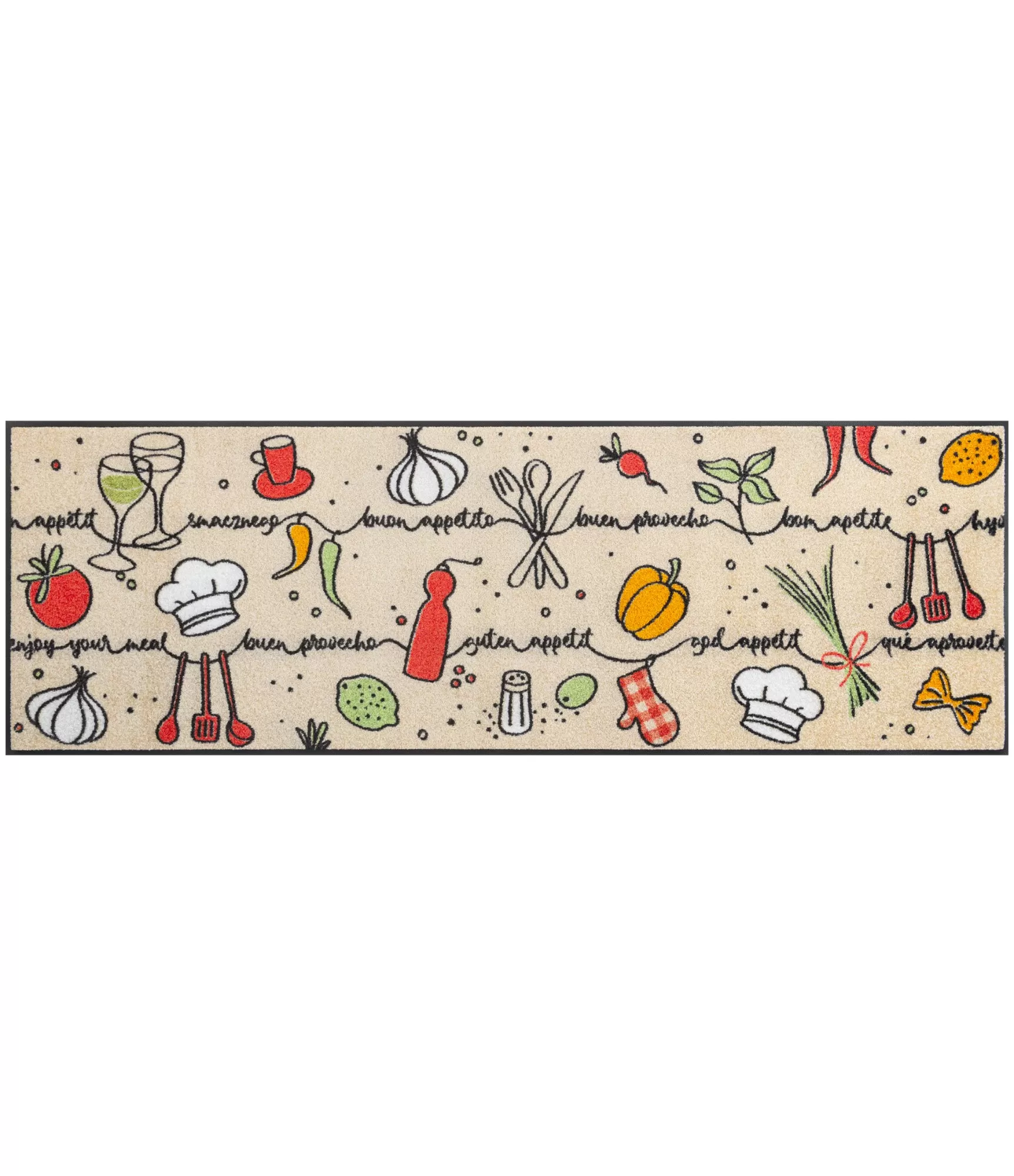 Mazgājams virtuves paklāja celiņš ar gaišu fonu un stilizētiem virtuves elementiem ir lielisks papildinājums kulinārām telpām. Dizainu papildina smalki uzraksti dažādās valodās ar novēlējumiem "Labu apetīti!", kas piešķir paklājam draudzīgu un iedvesmojošu noskaņu. Šis paklājs ne tikai estētiski rotā telpu, bet arī radā mājīgu un radošu atmosfēru virtuvē.