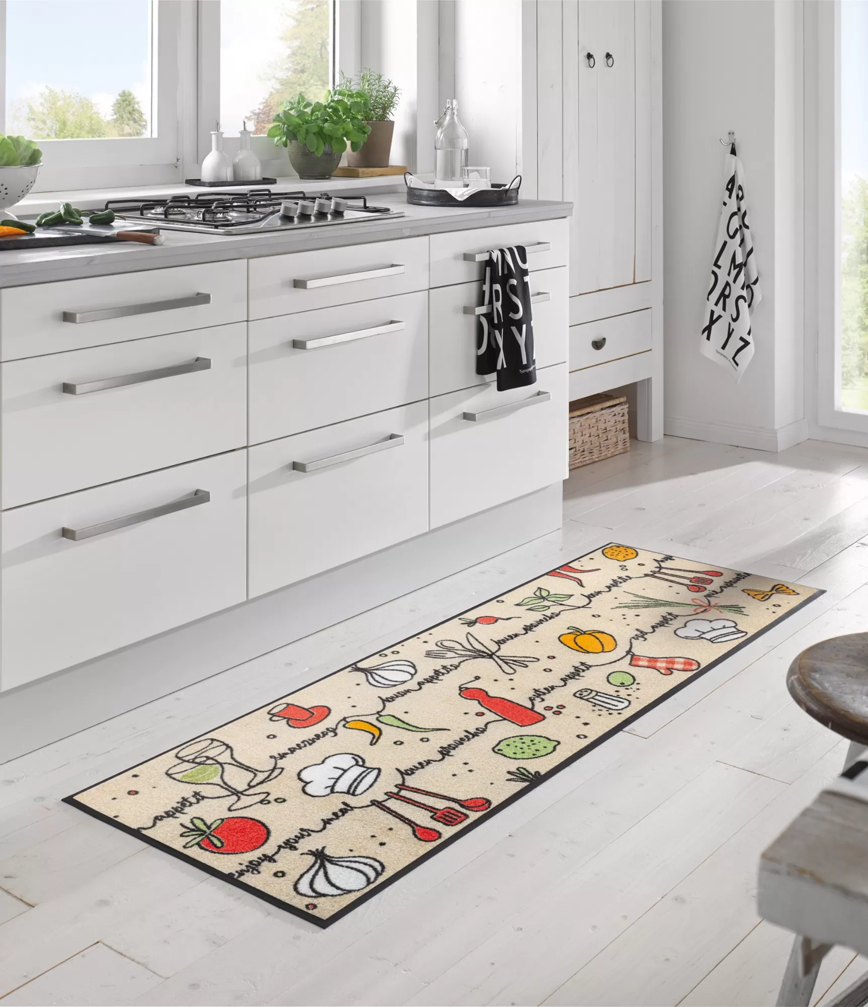 Garais paklājs virtuvei ar gaišu fonu un uzrunājošiem uzrakstiem izceļ telpas estētiku, saglabājot praktisku funkcionalitāti. Tas piešķir interjeram siltumu, aicina baudīt maltītes un rada viesmīlīgu vidi. Garā forma ideāli piestāv gan virtuvei, gan koridora zonām.