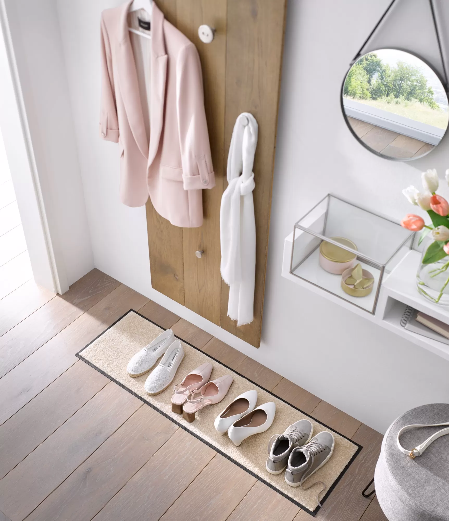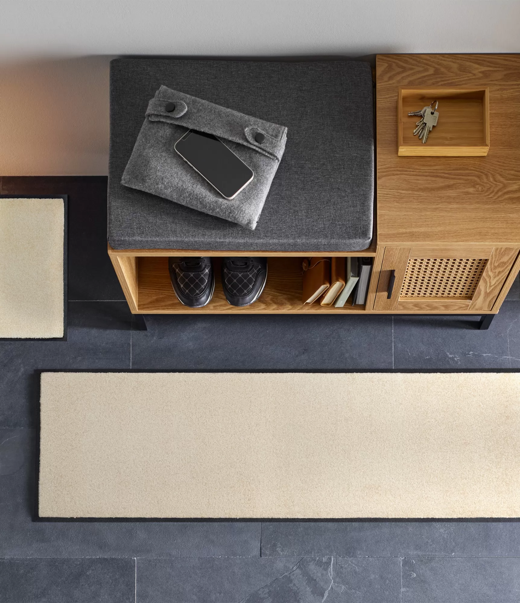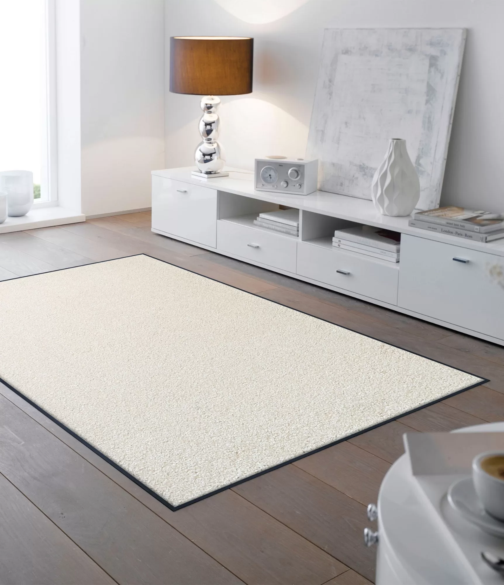 Pateicoties minimālistiskajam dizainam, šis modelis ir īpaši universāls – tas iederas gan modernā, gan klasiskā vai skandināvu interjerā. Lieliski sader ar gaišām grīdām, bet var arī vizuāli mīkstināt tumšākas telpas. To var izmantot pie ieejas, gaitenī, virtuvē vai kā garāku celiņu intensīvas kustības zonās. Plānais profils ļauj segumam viegli ietilpt zem durvīm, netraucējot to atvēršanu, tāpēc tas ir praktisks risinājums ikdienai.