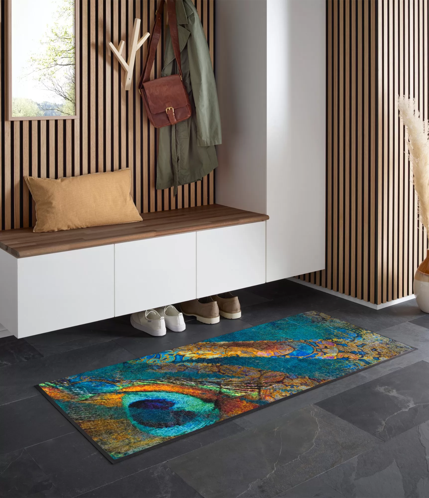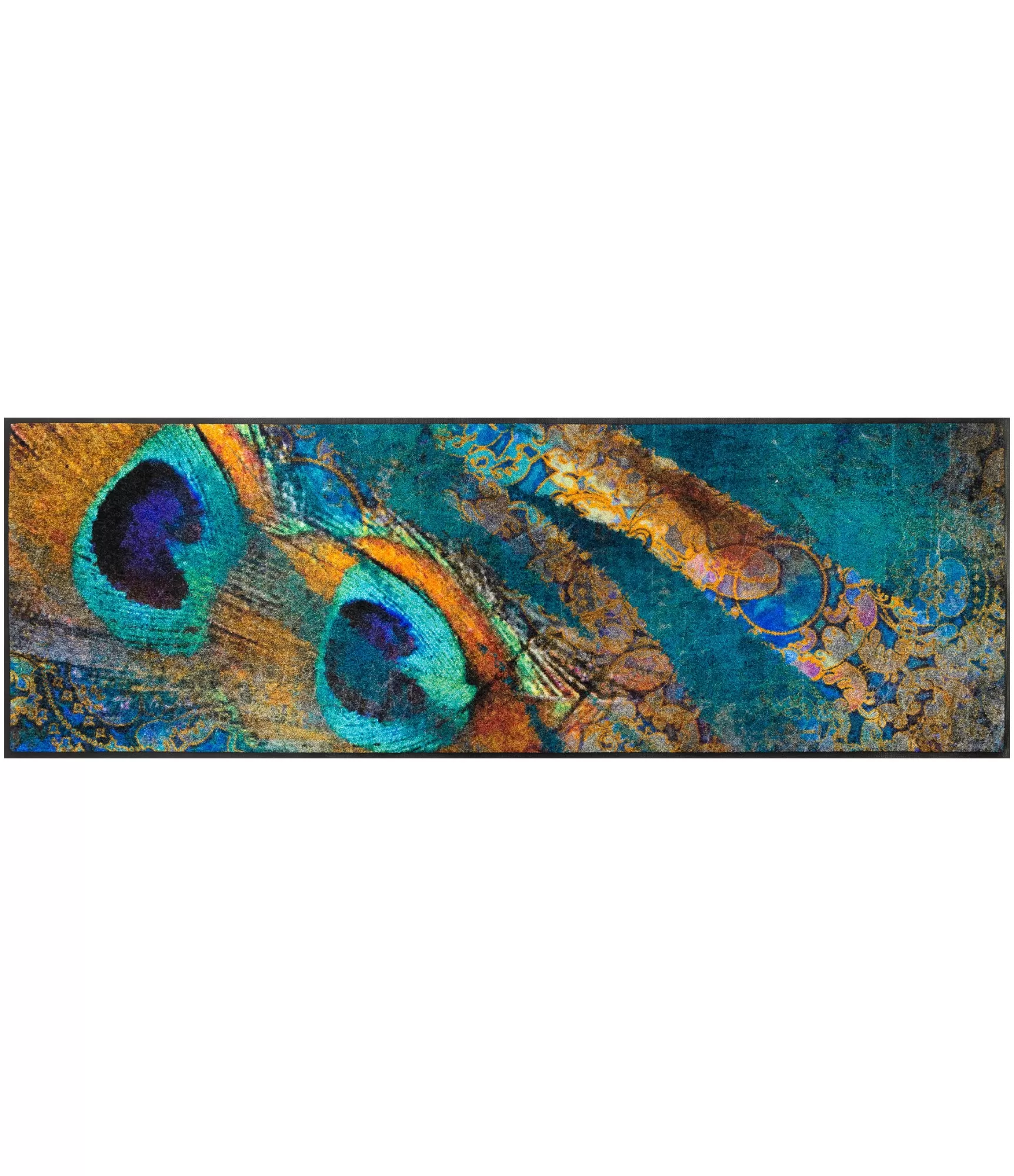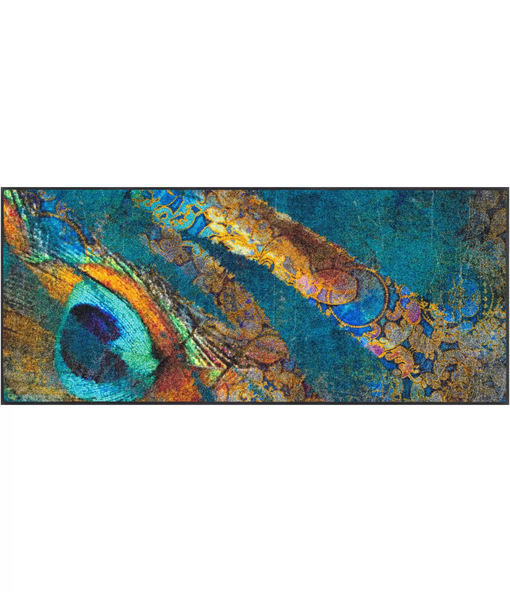 Šim paklāja skrējējam ir grezns dizains, kas apvieno zilās un zelta nokrāsas, lai atgādinātu pāva spalvu rakstu. Tas piešķir eleganci jebkurai telpai, ideāli piemērots greznam un ekskluzīvam interjeram. Trase ir ne tikai stilīga, bet arī ļoti praktiska, jo to ir viegli mazgāt un kopt. Augstas kvalitātes materiāli nodrošina, ka tas ilgstoši saglabās krāsas un formu. Tā ir ideāla izvēle tiem, kas vēlas radīt iespaidīgu un greznu tēlu savai mājai vai birojam.