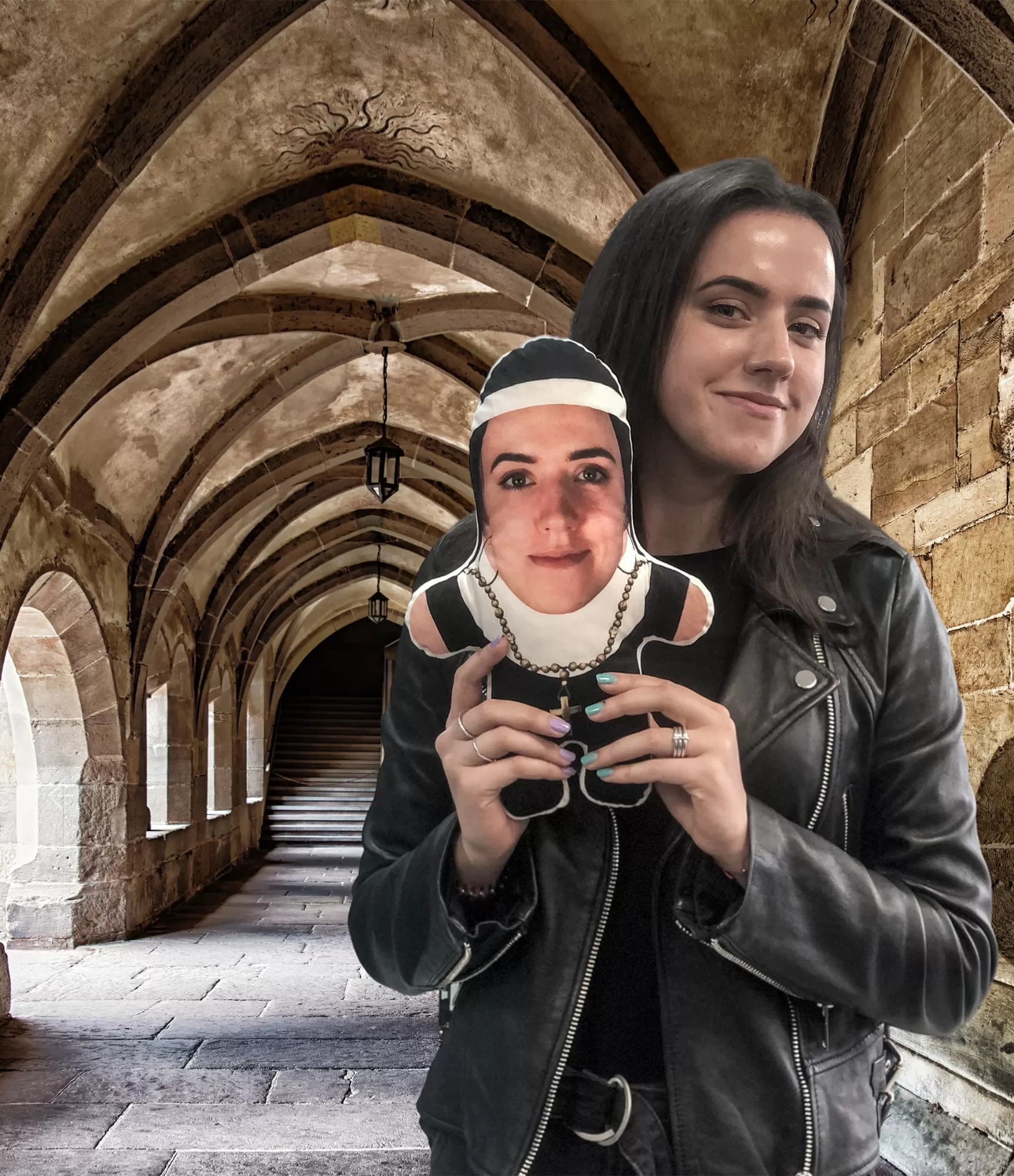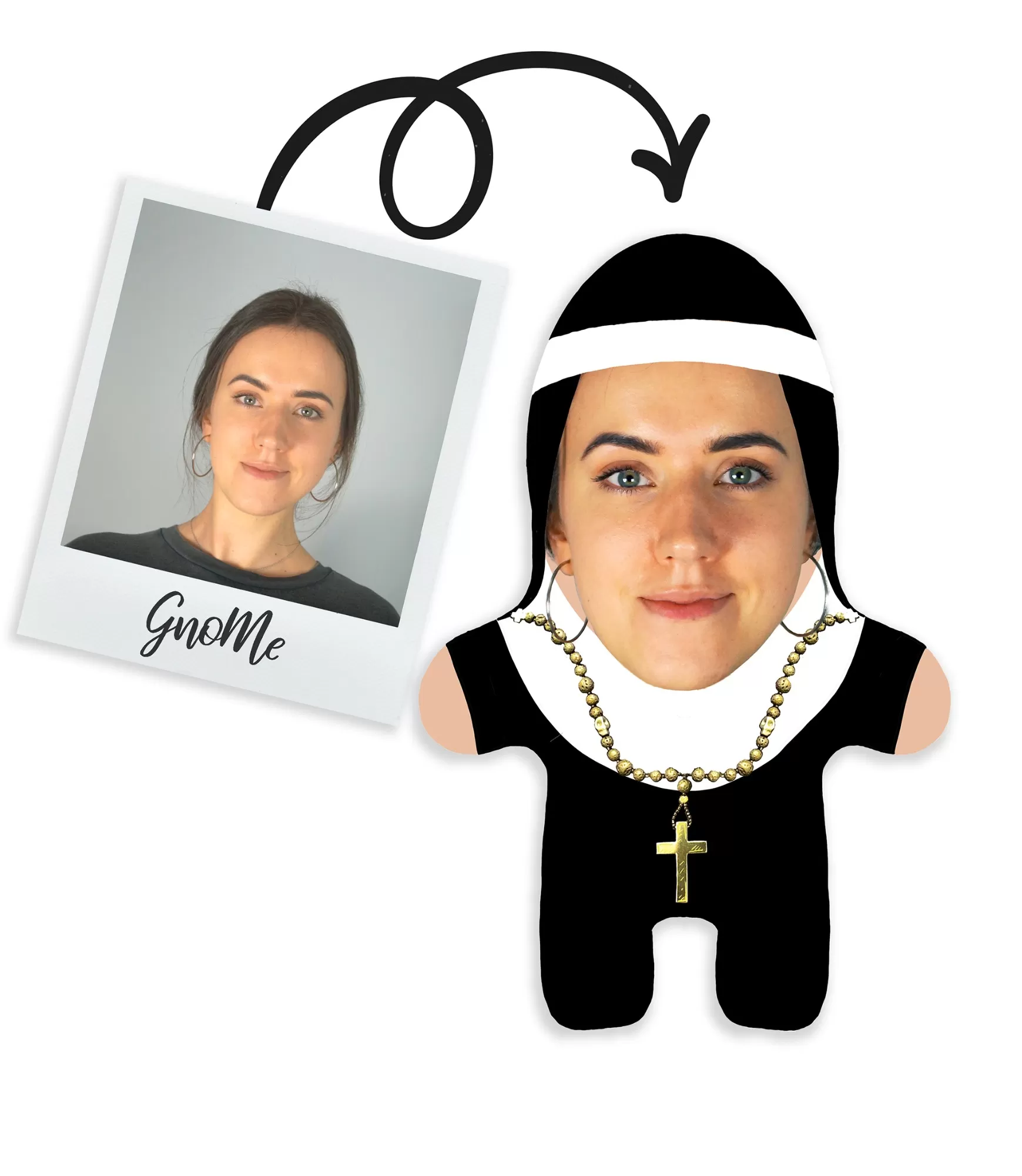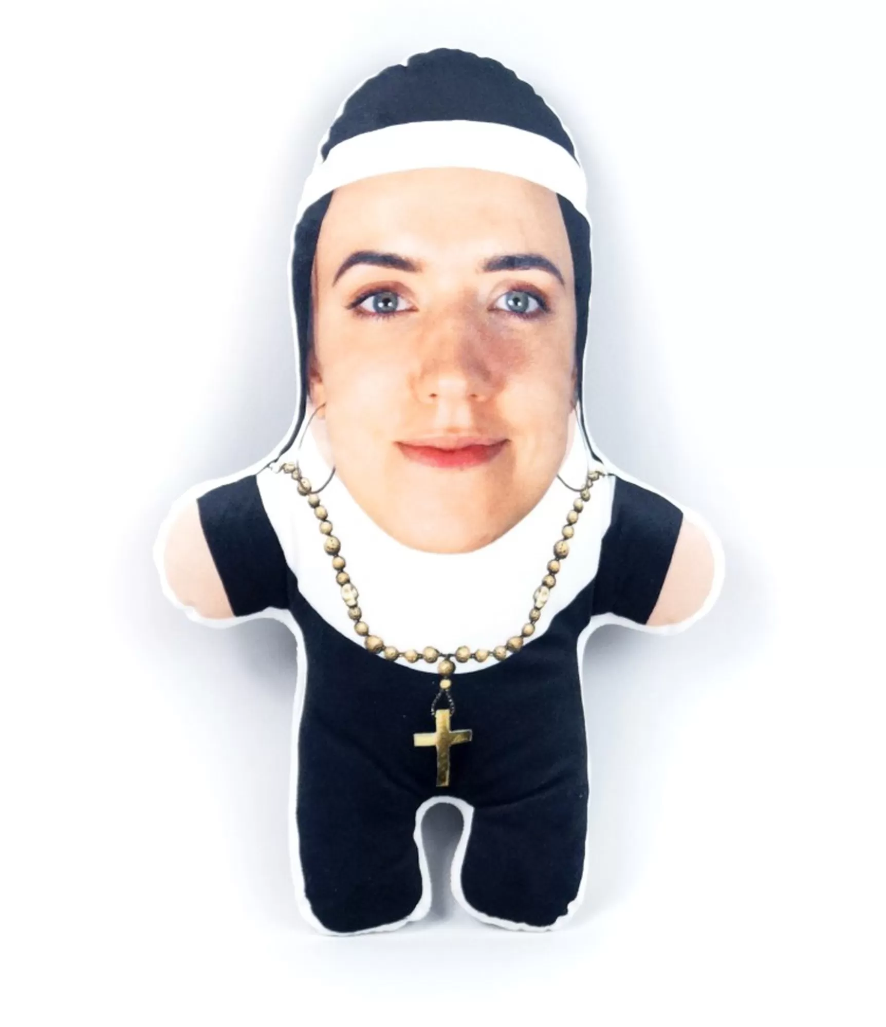 Personalizēts spilvens ar cilvēka sejas attēlu.