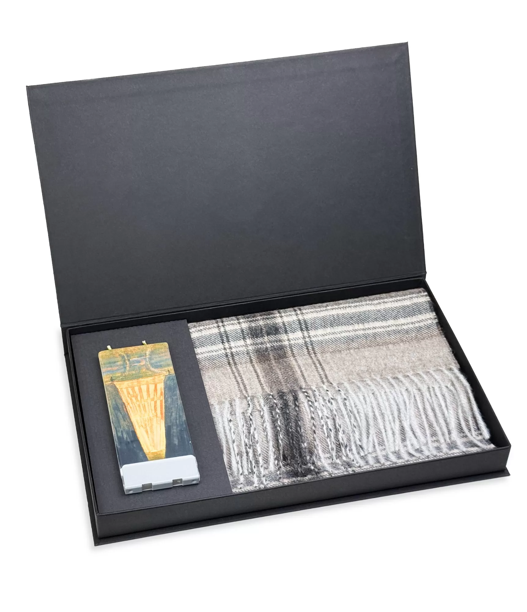 Oriģinālas dāvanas vīriešiem — brūni rūtaini šalic un sveces zodiaks.