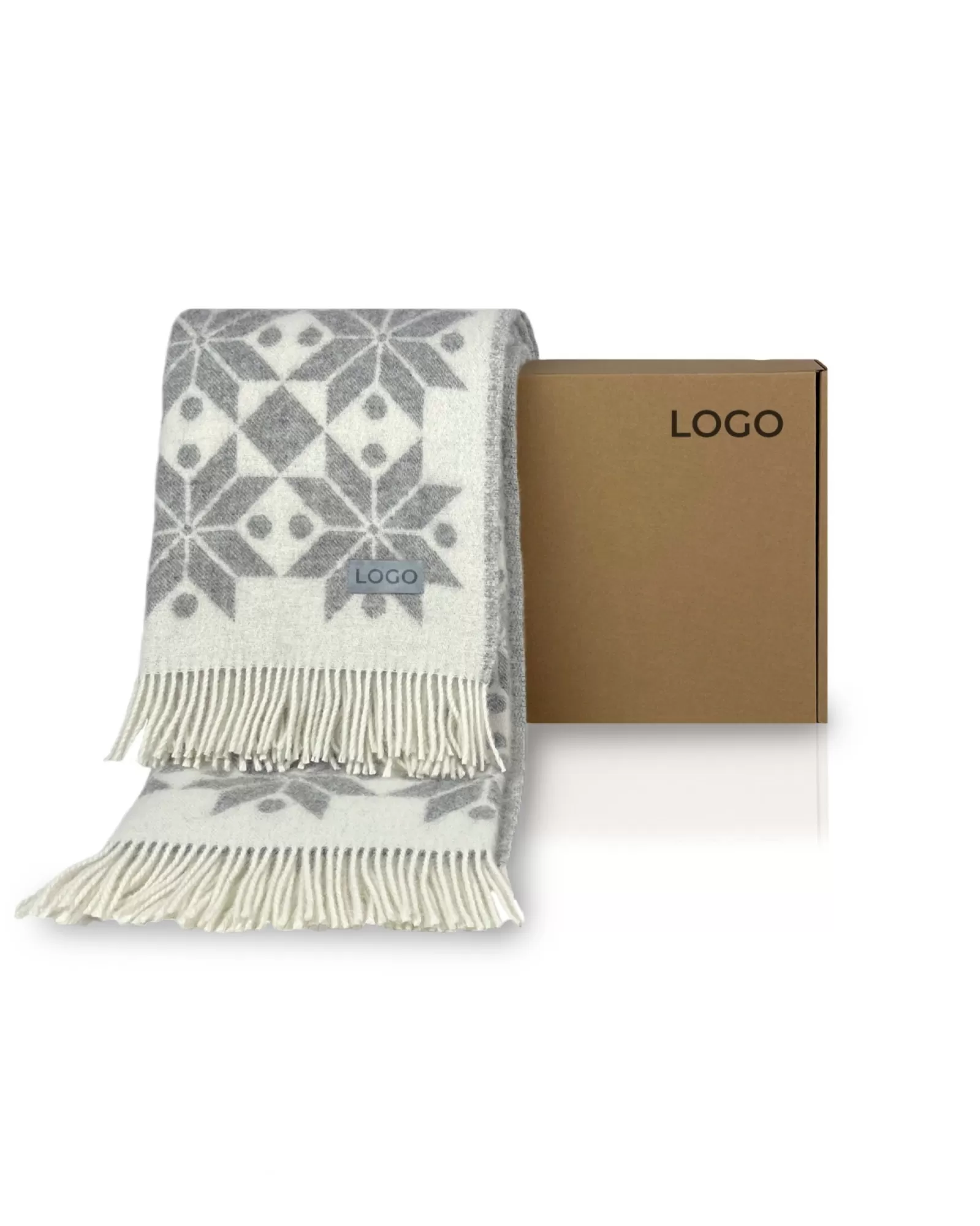 Komplekts ietver kastīti un pledu bez uzņēmuma logotipiem.