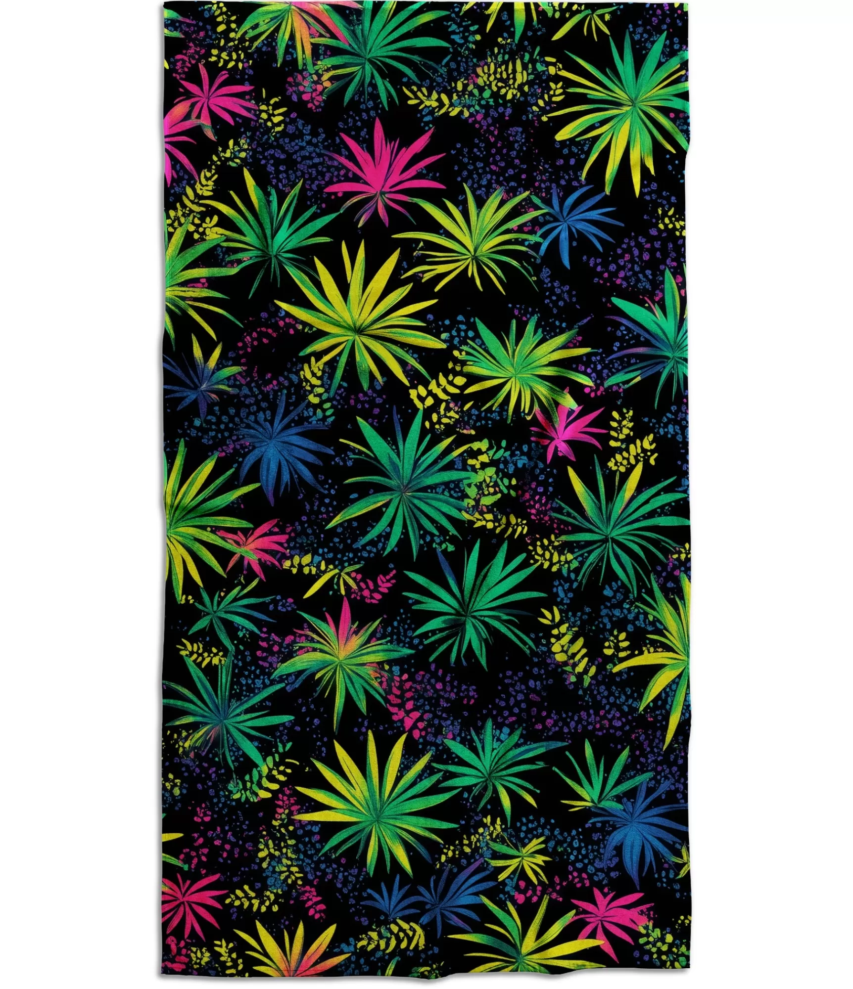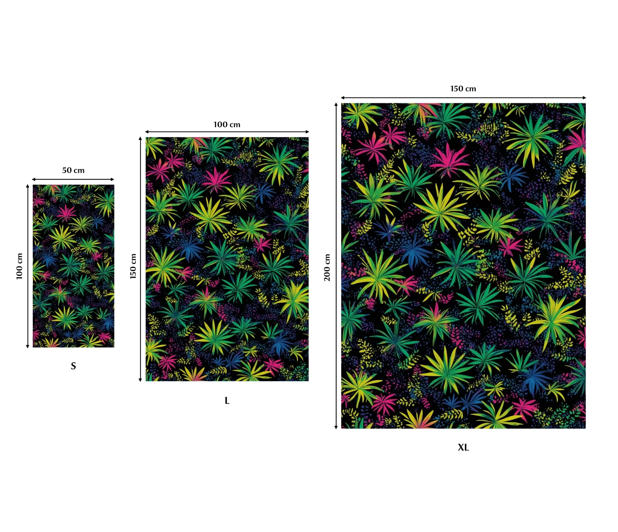 Dizaina pamatne lieliski iederas poliestera pusē drukāšanai – krāsas šeit ir patiesas, bagātīgas un noturīgas pat pēc daudzām mazgāšanas reizēm. Rokasšdaivas otra puse – minkšta, balta, ražotaš 100% kokvilnas frotē audums, nodrošina ērtu un efektīvu skrāpēšanu. Divslāņu konstrukcija ļauj izbaudīt gan estētiku, gan funkcionalitāti – vienā pusē krāsains, tropu iedvesmots dizains, no otras puses – šelle, dabīgs audums.
