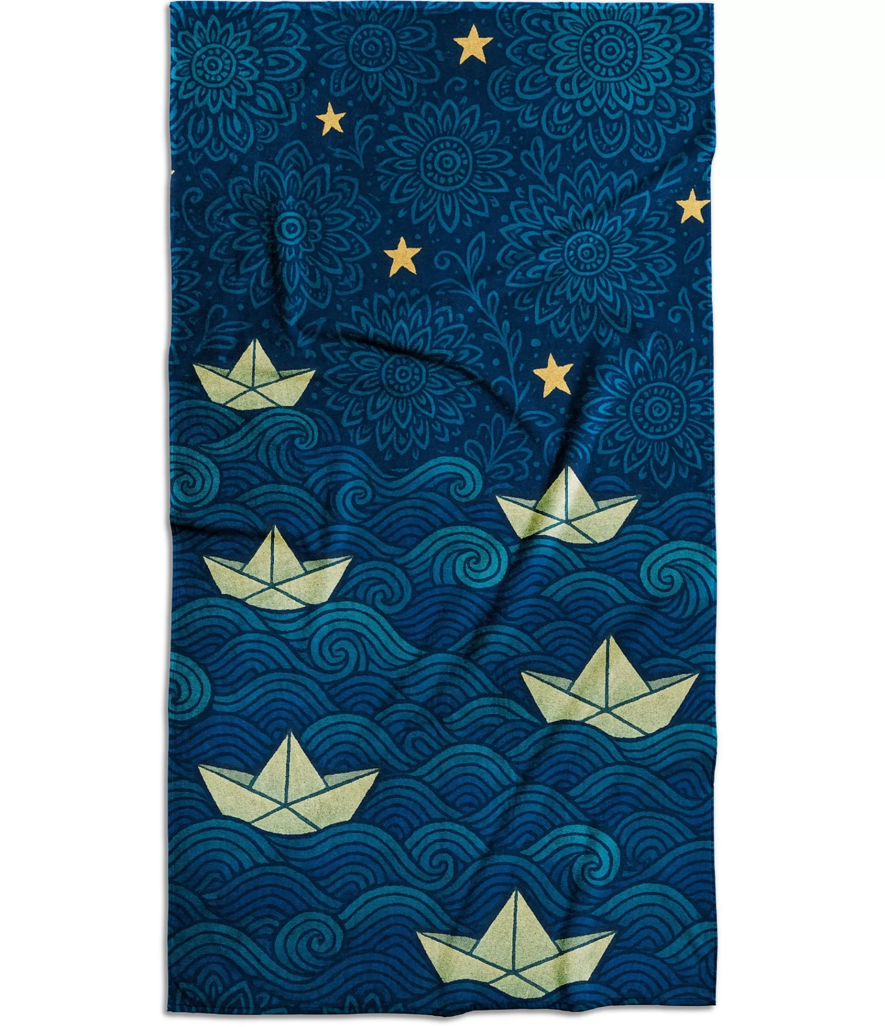 Nakts ir piepildīta ar mieru šrokasšdizainā – dziļi zilais fons pārvēršas jūrā ar lēnām peldošām papīra laivām. Virš viņu – zelta krāsas zvaigznes un mākoņi, debesis zied ar augu ornamentiem. Tas nav tikai audums – tā ir pasaka, kas var izvērsties uz smiltīm, baseina malas vai vannas istabas grīdas. Armš ielāpi, kas paredzēti š šādas mākslinieciskas ilustrācijas iedvesmo apstāties, sapņot un atpūsties no steigas. Krāsu palete šeit smalki apvieno tumšos ūdens toņus ar spilgtiem kontrastiem – šatvērtās laivas kļūst par švējiem visā sastāvā.