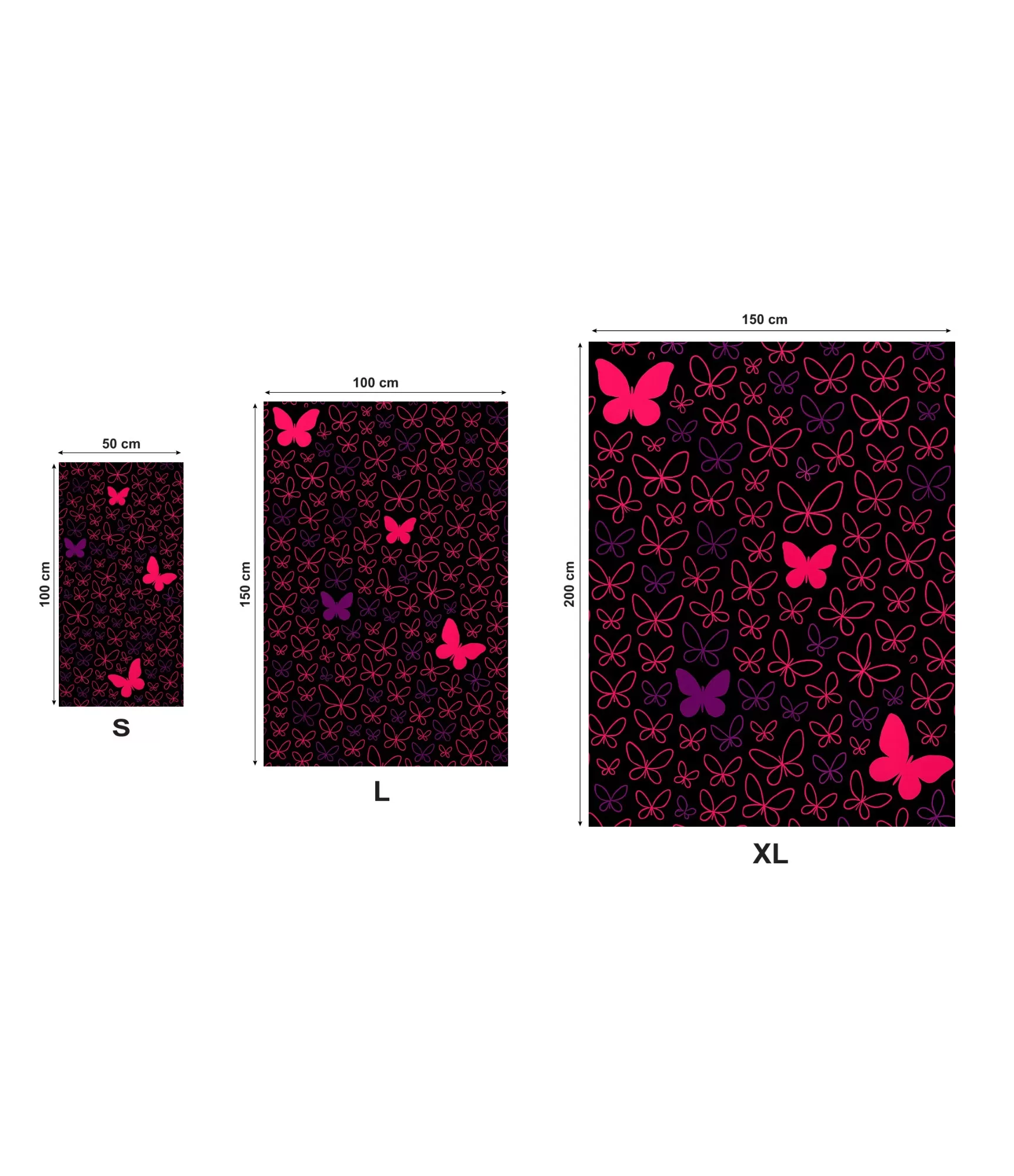 Šir rokušplāksne ir pieejama vairākos izmēros – S (50x100 cm), L (100x150 cm) un XL (150x200 cm), padarot to lieliski piemērotu dažādām situācijām. Mazāks – ceļojumiem, baseinam vai bērniem, lielāks – pilnīgai atpūtai pie jūras vai ezera. Svarīgi pieminēt, ka pirmajā fotoattēlā redzams tieši S izmērs – tādēļ, izvēloties lielāku, tauriņu sastāvs var dabiski nedaudz mainīties mēroga dēļ. Tas dod katrai rokaiš ielāps savu raksturu.