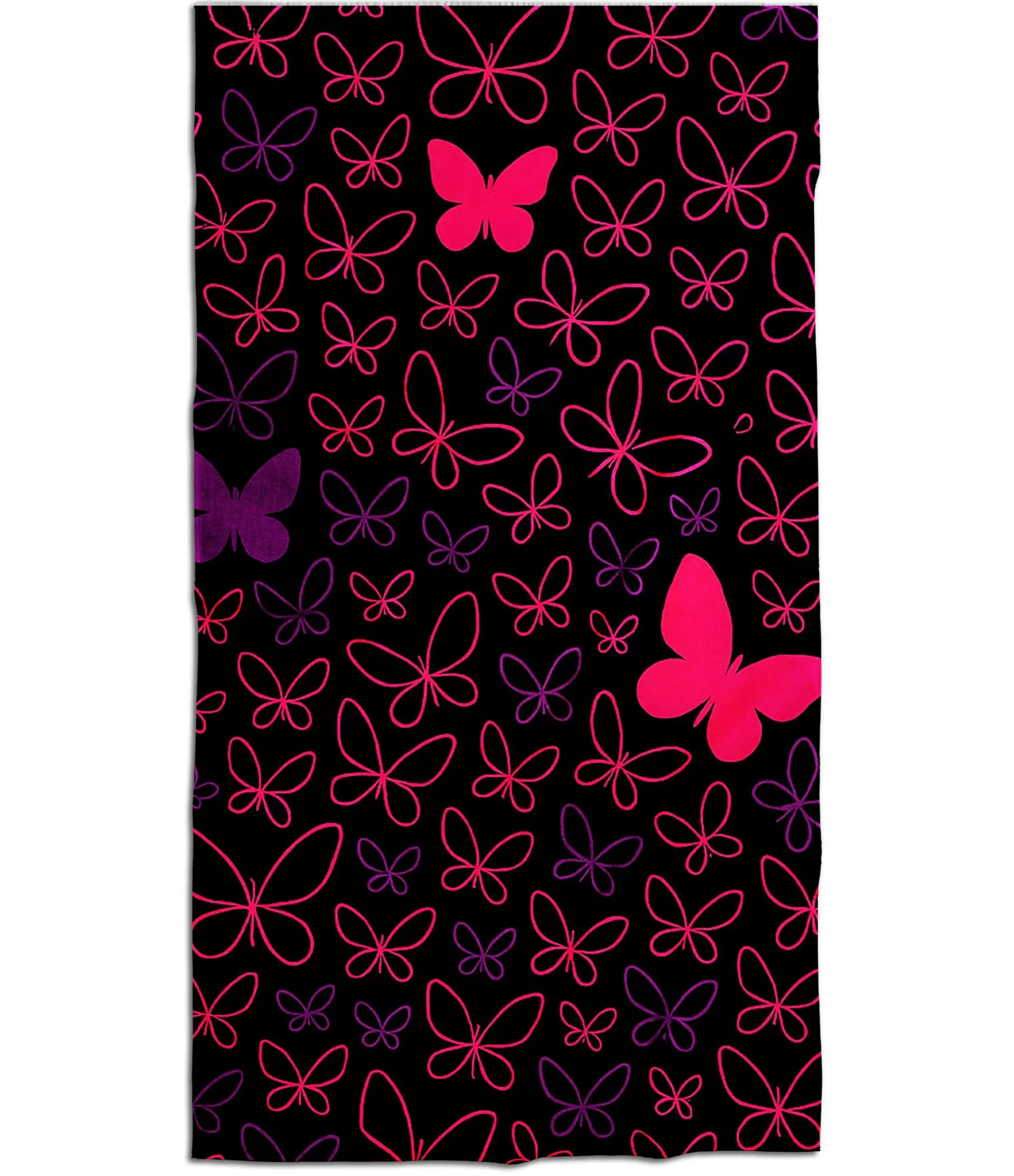 Spēcīgs kontrasts starp melno fonu un neona tauriņu siluetiem iš uzreiz iekrīt acīs. Tas nav tikai pludmales dvielis – tas ir stila paziņojums, drosmīgs, bet tajā pašā laikā elegants akcents ikvienam, kam patīk izcelties. Rozā un violetie tauriņi, it kā peldot gaisā, rada kustības un brīvības iespaidu, un to līnijas atgādina lidojošas domas vai atvaļinājuma atmiņas, no kurām negribas palaist vaļā. Visa kompozīcija pulsē ar enerģiju, taču tā paliek harmoniski išmācīta – kā vasaras nakts acs, kad debesis kļūst tumši zilas un laikapstākļi sāk mirgot sapņu formā.
