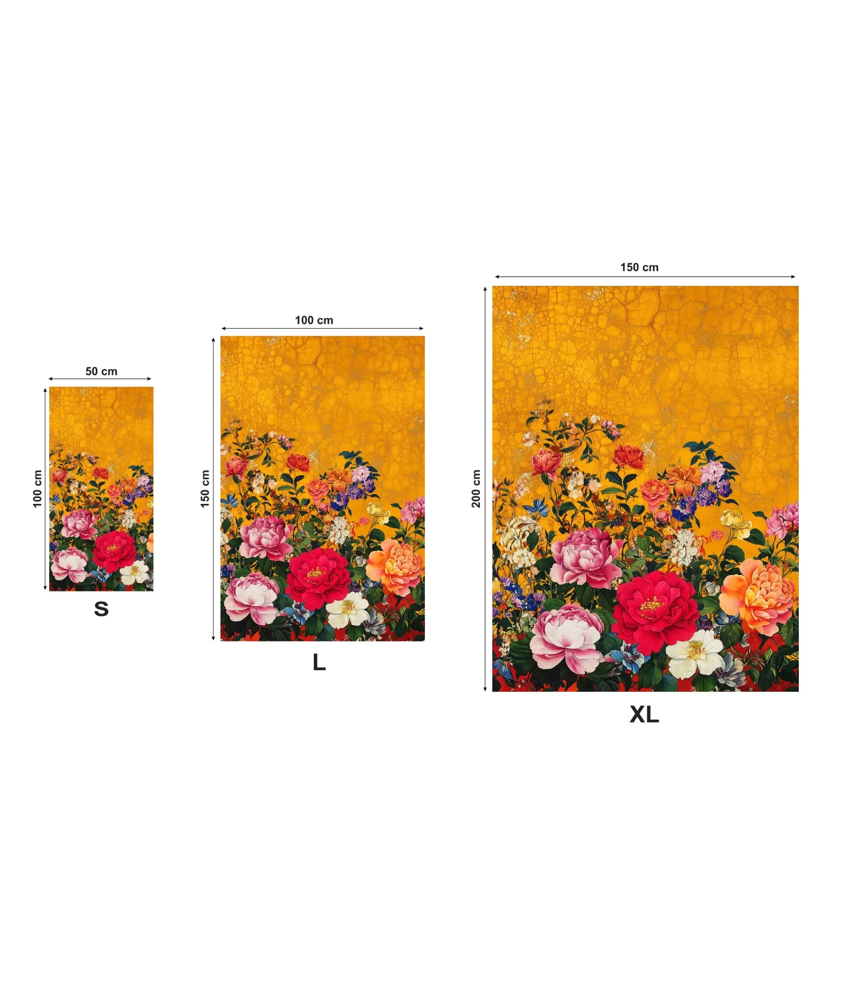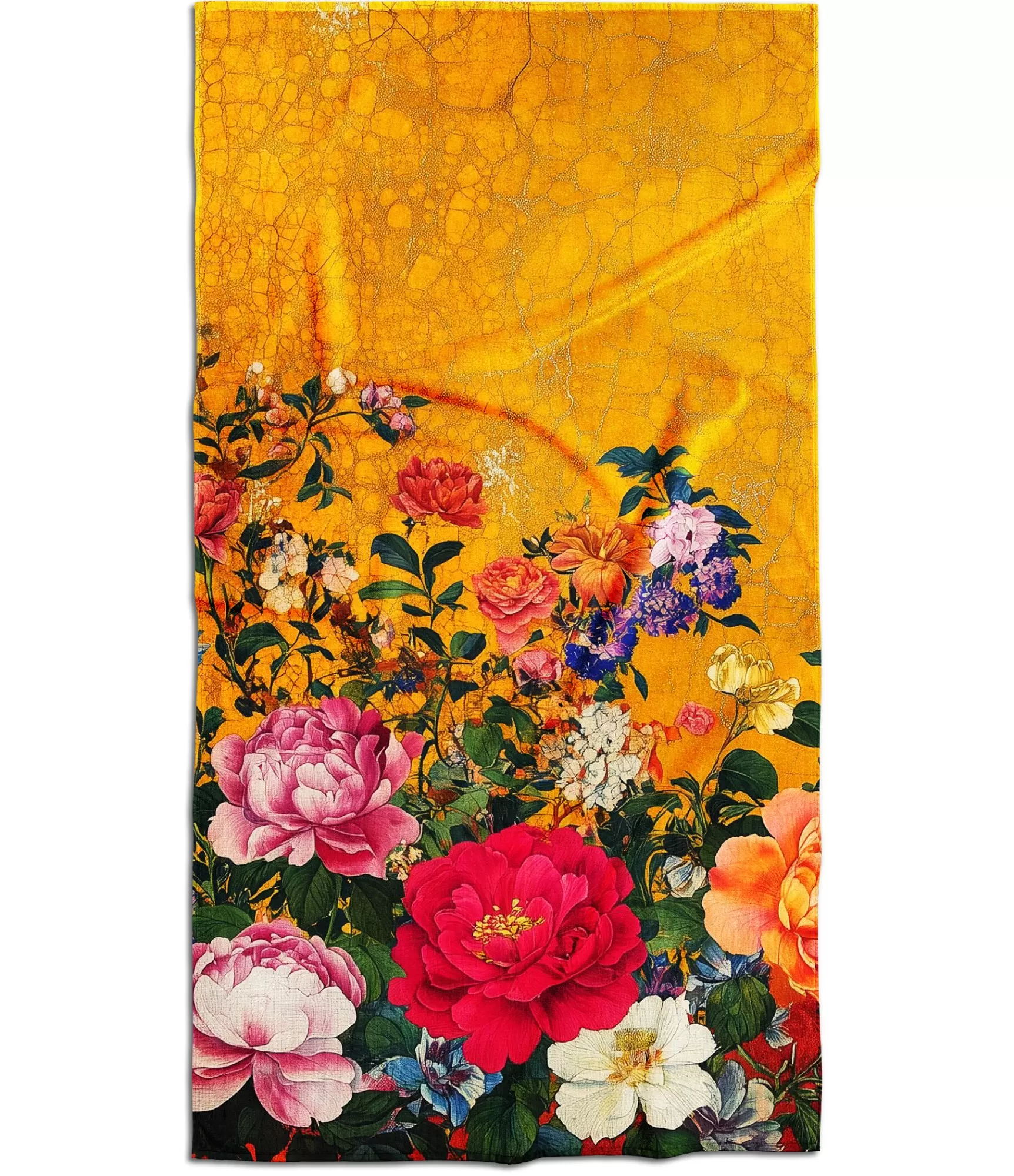 Spilgti kā saules pieskāriens, šķiet, ka jūsu plauksta jūs ieved ziedu sprādziena vidū. Zeltainais fons atgādina senu gleznotu attēlu ar smalkām plaisām, kā laika skartu audeklu. Bet esš š šīs vēsturiskās dzeltenās ir kā iš izplūst dzīvības pilns dārzs – no apakšas dīgst lieli sarkani, rozā, oranži, violeti un balti ziedi, kas aizņem visu kompozīcijas apakšējo daļu. Katrs gredzens šeit – kā atsevišķs insults, iš palielināts līdz maksimālajam skaistumam, krāsai un detaļām. Ziedi izskatās gandrīz īsti, to ziedlapiņas slīd viena pāri, spēlējoties ar gaismu un zaļumu, un šķiet, ka zaļās lapas aizsargā to krāsu trauslumu. Šeit apzināti ir atstāta rokas augšdaļa – dzeltenais fons ļauj iztēlei elpot un rada skaistu kontrastu starp šilm un bloom. Rokasšdaivas otra puse – viss balts, kokvilnas, piemērots skrāpēšanai. Apdrukas puse, kas apdrukāta uz poliestera, saglabā ārkārtīgi spilgtas krāsas un attēla skaidrību, tāpēc dizains ir ne tikai skaists, bet arī funkcionāls.