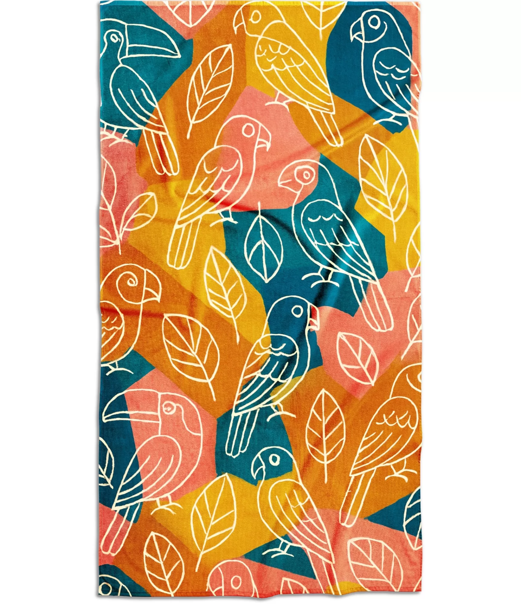 Bagātīga, krāsaina, detalizēta apdruka vienā pusē, kas neizbalē un lieliski saglabā savu bagātību pat pēc daudzām mazgāšanas reizēm. Putnu kontūras skaidri izceļas raibajā krāsu kompozīcijā – it kā uzmanīgi zīmētu ar baltu marķieri uz krāsaina papīra. Otra puse – 100% kokvilnas frotē audums, balts un švelns uz tausti. Š šī kombinācija ļauj izbaudīt ne tikai vizuālo iespaidu, bet arī komfortu – viena puse ir skaistumam un stilam, otra – praksei un velna dēļ. Materiāla struktūra nodrošina ātru mitruma uzsūkšanos un žāvēšanas ātrumu – īstu atspirdzinājumu ceļojot vai atpūšoties pludmalē.