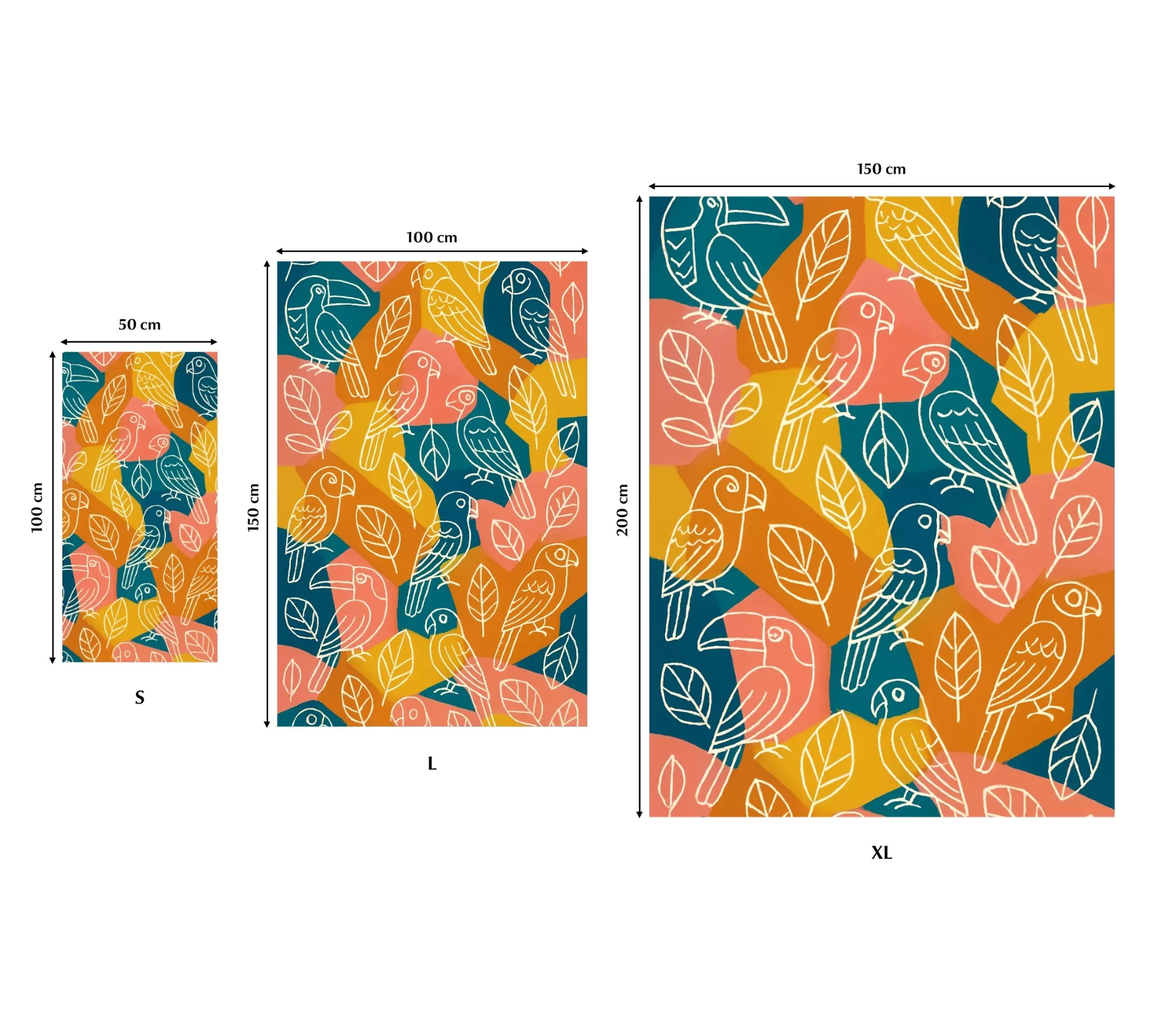 Spilgtas krāsas, tropiska noskaņa un grafiskais dizains – tā ir rokaš gabals, kas iš apbur ar savu rotaļīgumu no pirmā acu uzmetiena. Ar vieglu kontūru zīmētie putni piesaista skatienu, it kā tās būtu stilizētas gleznas. bērnības svētku piezīmju grāmatiņa. Katram putnam šeit ir savs raksturs – daži nopietni skatās tālumā, citi ziņkārīgi groza galvu, it kā meklētu draugu, un fons ap viņiem kļūst par dinamisku krāsu mozaīku. Oranži, dzelteni, rozā un dziļi zili ģeometriski bloki rada intensīvu, kontrastējošu ritmu, kas atgādina karstu tropu pēcpusdienu ar debesu un zemes atspulgu. Š motīvu piepilda siltums, putnu čivināšana un viegla vasaras vēsma – tas nav štikai spļāviensš, bet gan stila manifests.