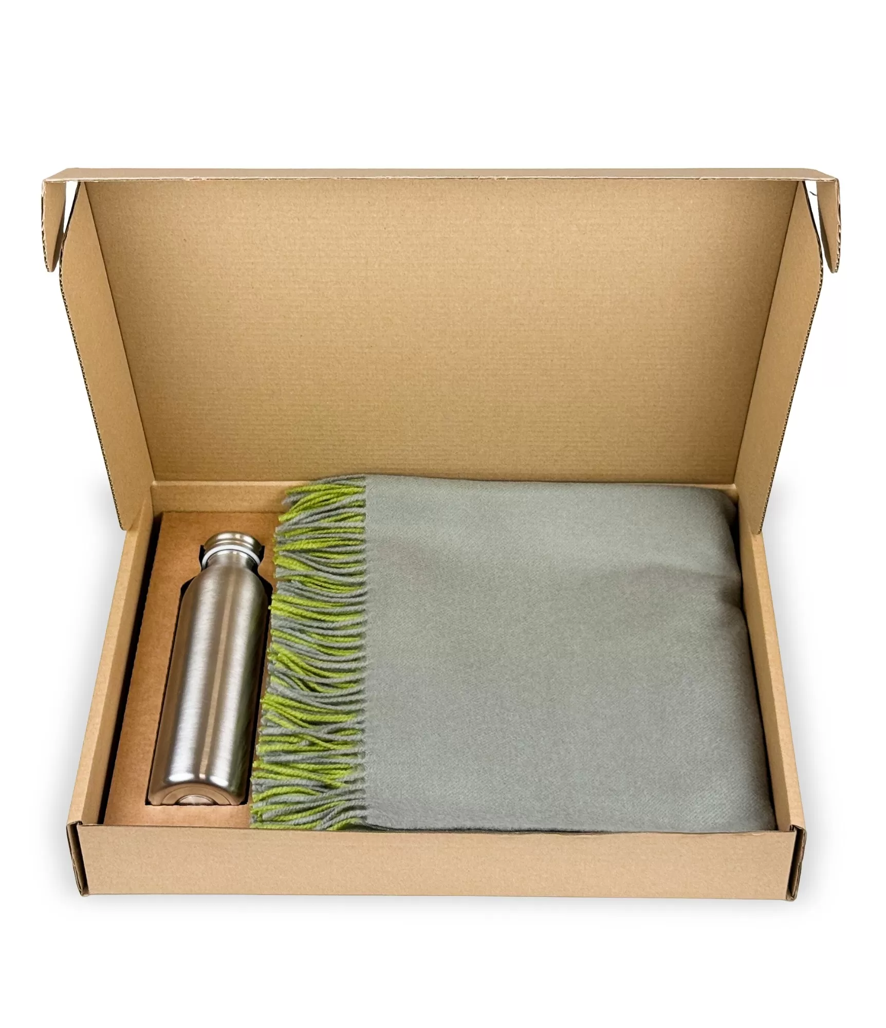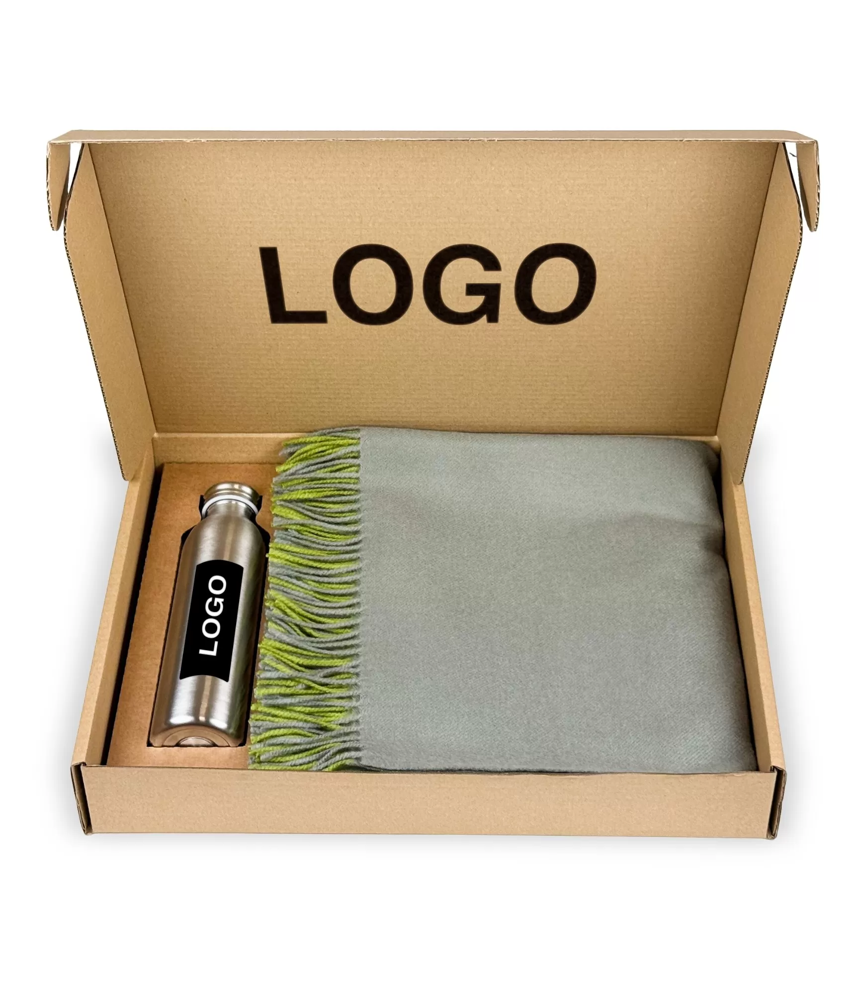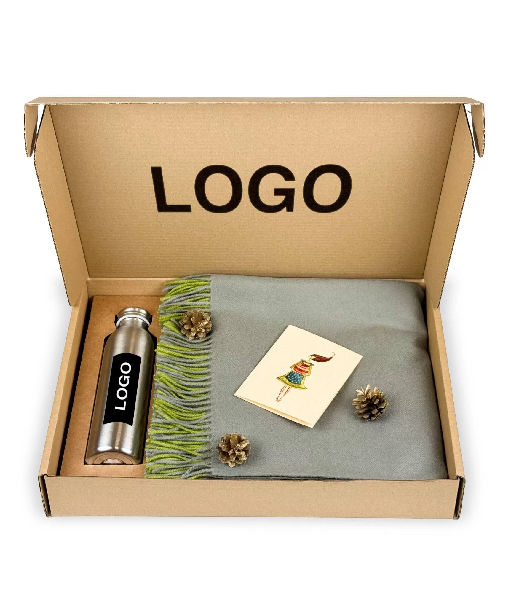 Dāvanu komplekti uzņēmumiem ar logotipu – Merino vilnas segas un dzērāji.