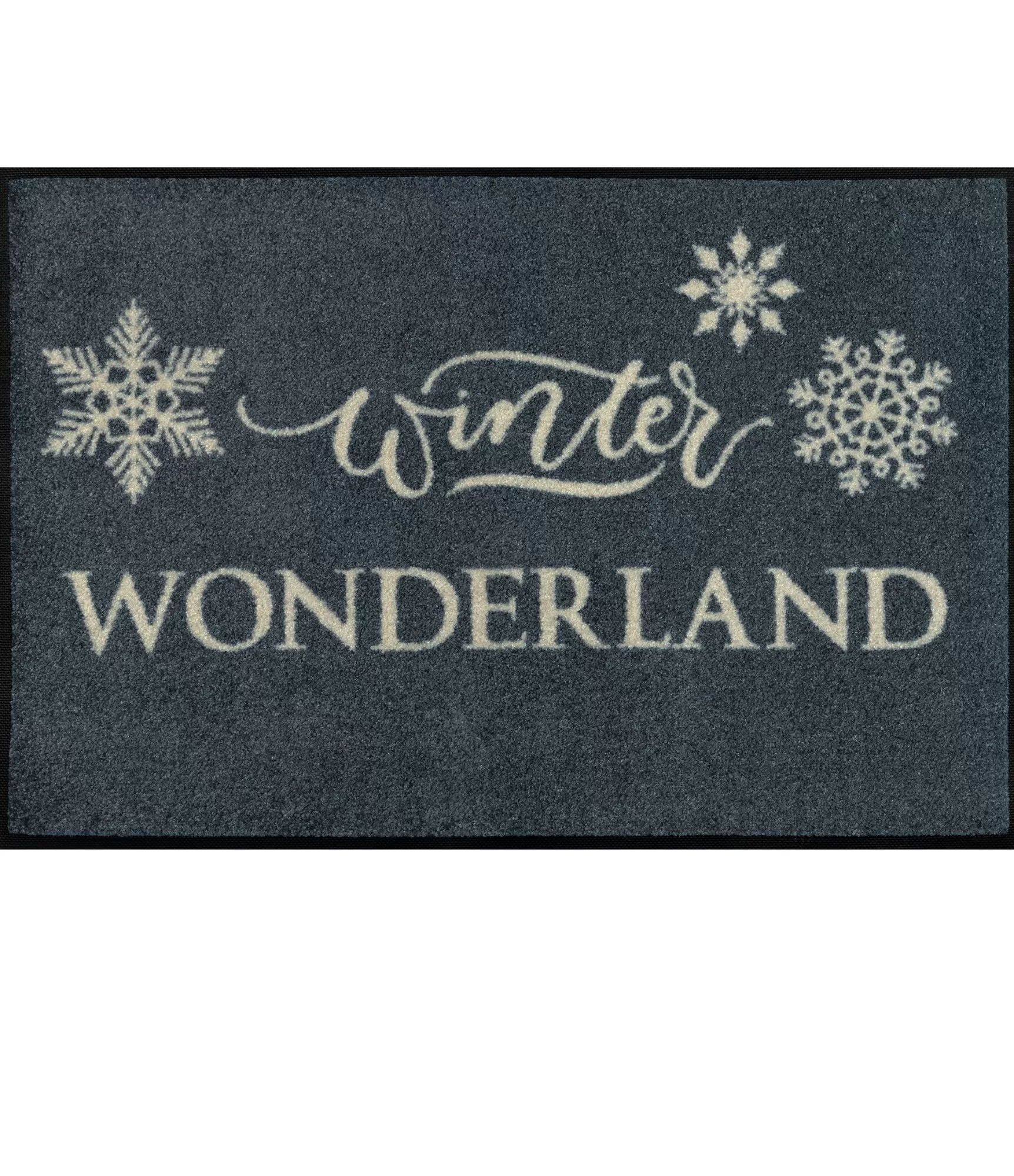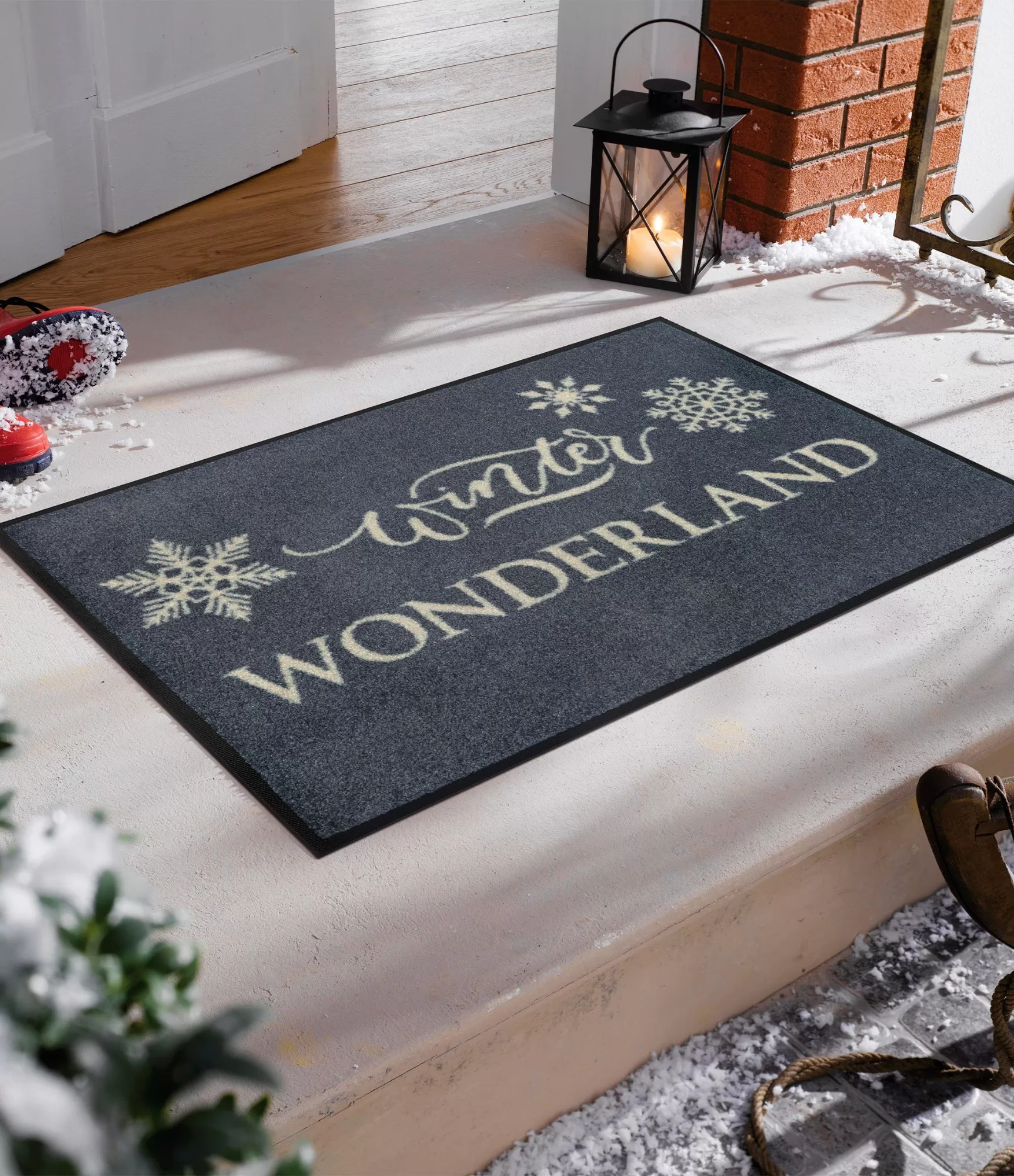 Ziemas sniegpārsliņām dekorēts durvju paklājiņš minimālisma stilā Ziemassvētku noskaņas radīšanai mājās.