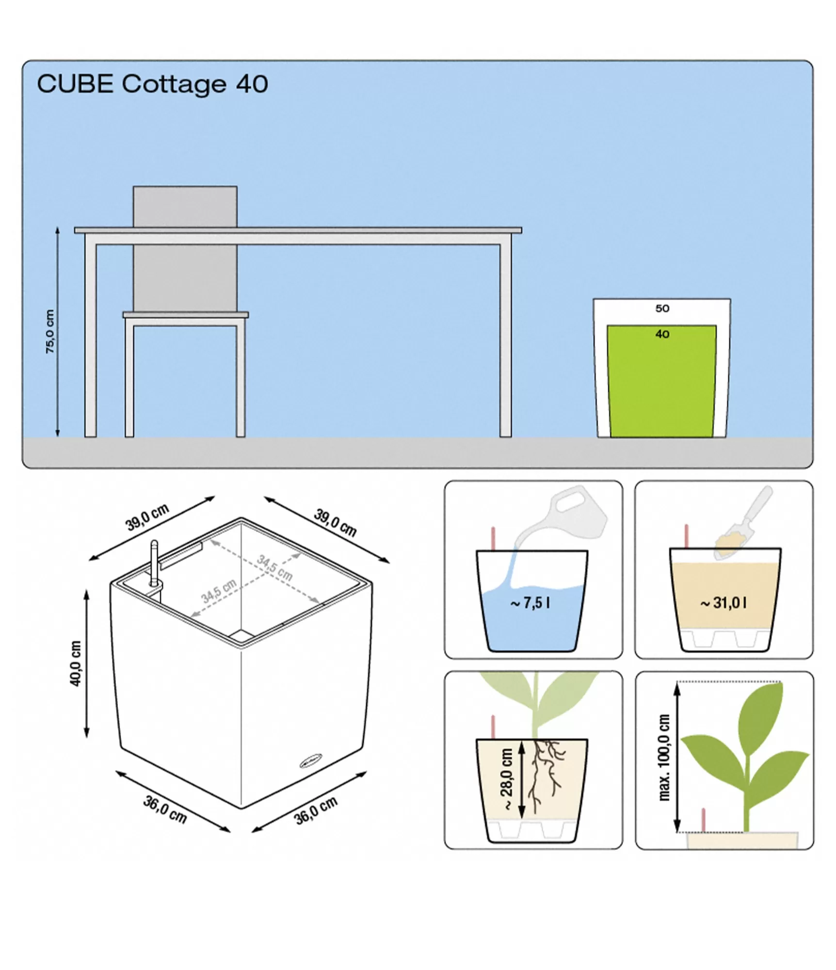 Visiem LECHUZA podiem ir ārējais pods un laistīšanas sistēma, kas nodrošina labāku augu augšanu.