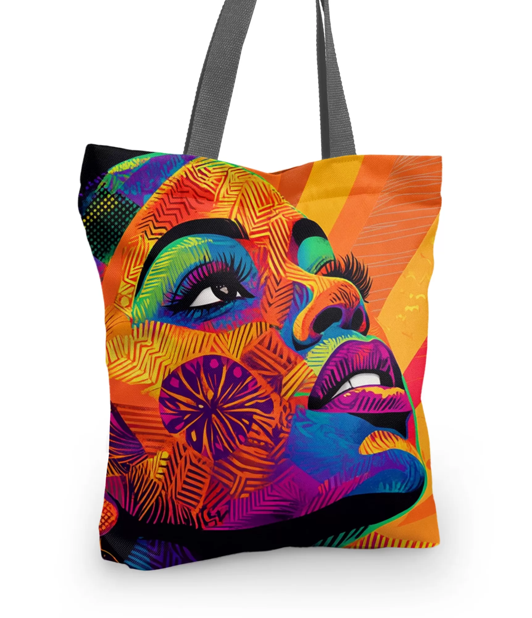 Spilgtas krāsas, ģeometriski raksti, gaismas stari un sieviete, kas skatās tālumā. Šķiet, ka šī rokassomiņa ir radīta mūsdienu varonei. Sievietes seja kompozīcijas centrā, kas krāsota spilgti oranžu, zilu, rozā un violetu toņu kombinācijā, izstaro pārliecību, brīvību un radošu enerģiju. Fons ar oranžiem stariem vēl vairāk uzlabo novītuma iespaidu, savukārt tumšākās detaļas piešķir dziļumu un spēku. Tas ir aksesuārs, kas nepaliek nepamanīts – katrs triepiens šeit runā par autentiskumu un personību.